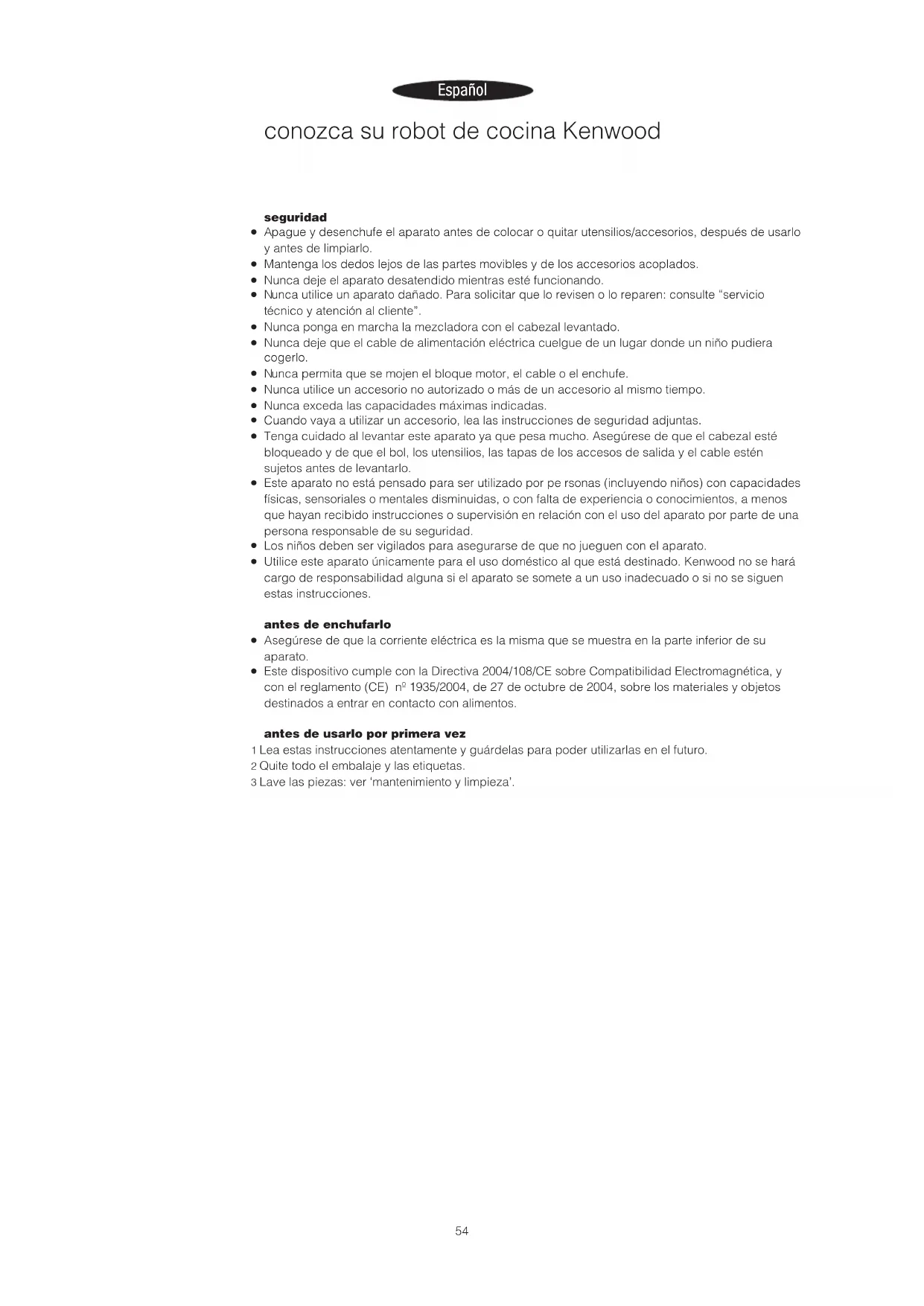 Este dispositivo cumple con la Directiva 2004/108/CE sobre Compatibilidad Electromagnética, y con el reglamento (CE) nº 1935/2004, de 27 de octubre de 2004, sobre los materiales y objetos destinados a entrar en contacto con alimentos. antes de usarlo por primera vez 1 Lea estas instrucciones atentamente y guárdelas para poder utilizarlas en el futuro. 2 Quite todo el embalaje y las etiquetas. 3 Lave las piezas: ver ‘mantenimiento y limpieza’. conozca su robot de cocina Kenwood