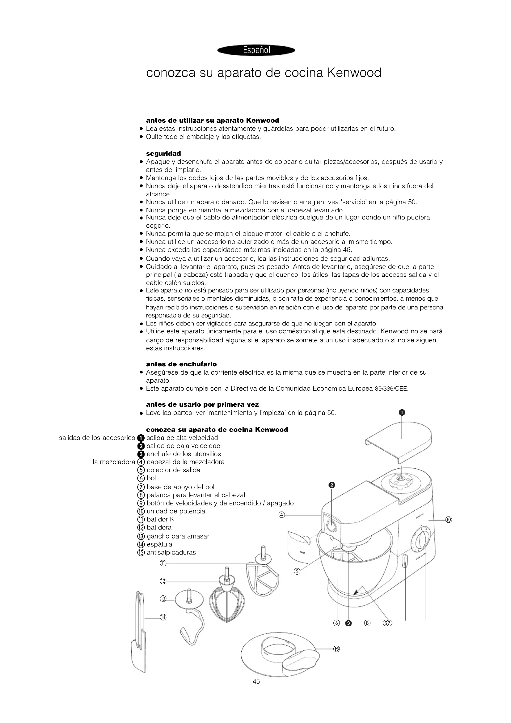 Lave las partes: ver ‘mantenimiento y limpieza’ en la página 50. conozca su aparato de cocina Kenwood salidas de los accesorios salida de alta velocidad salida de baja velocidad enchufe de los utensilios la mezcladora cabezal de la mezcladora colector de salida bol base de apoyo del bol palanca para levantar el cabezal botón de velocidades y de encendido / apagado unidad de potencia batidor K batidora gancho para amasar espátula antisalpicaduras conozca su aparato de cocina Kenwood