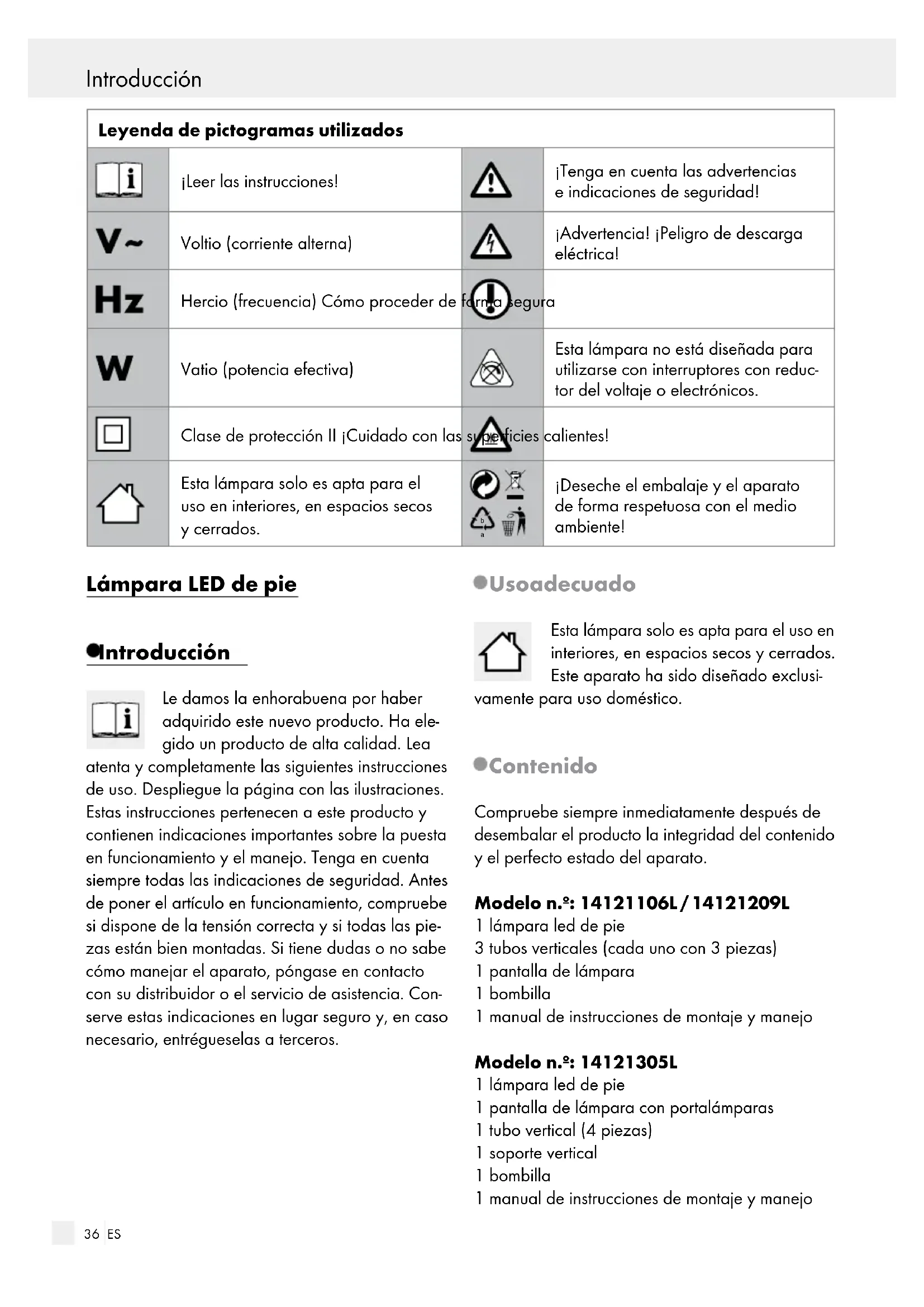 ¡Deseche el embalaje y el aparato de forma respetuosa con el medio ambiente! Lámpara LED de pie Introducción Le damos la enhorabuena por haber adquirido este nuevo producto. Ha ele- gido un producto de alta calidad. Lea atenta y completamente las siguientes instrucciones de uso. Despliegue la página con las ilustraciones. Estas instrucciones pertenecen a este producto y contienen indicaciones importantes sobre la puesta en funcionamiento y el manejo. Tenga en cuenta siempre todas las indicaciones de seguridad. Antes de poner el artículo en funcionamiento, compruebe si dispone de la tensión correcta y si todas las pie- zas están bien montadas. Si tiene dudas o no sabe cómo manejar el aparato, póngase en contacto con su distribuidor o el servicio de asistencia. Con- serve estas indicaciones en lugar seguro y, en caso necesario, entrégueselas a terceros. Uso adecuado Esta lámpara solo es apta para el uso en interiores, en espacios secos y cerrados. Este aparato ha sido diseñado exclusi- vamente para uso doméstico. Contenido Compruebe siempre inmediatamente después de desembalar el producto la integridad del contenido y el perfecto estado del aparato. Modelo n.º: 14121106L / 14121209L 1 lámpara led de pie 3 tubos verticales (cada uno con 3 piezas) 1 pantalla de lámpara 1 bombilla 1 manual de instrucciones de montaje y manejo Modelo n.º: 14121305L 1 lámpara led de pie 1 pantalla de lámpara con portalámparas 1 tubo vertical (4 piezas) 1 soporte vertical 1 bombilla 1 manual de instrucciones de montaje y manejo Introducción / Seguridad37 ES Introducción Introducción / Seguridad Descripción de las piezas