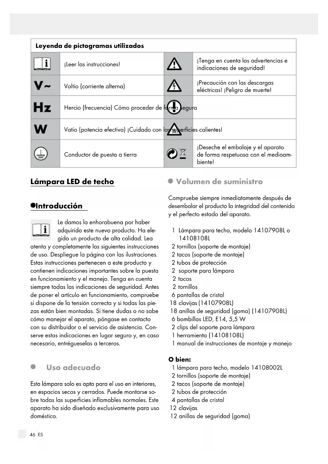 50 Hz 14108002L adicional: GU10, máx. 5 W, 220–240 V 50 Hz Potencia nominal máxima: 6 x 5,5 W (14107908L / 14108108L) 2 x 5 W GU10 + 4 x 5,5 W E14 (14108002L) Clase de protección: I Seguridad Indicaciones de seguridad ¡El derecho de garantía quedará anulado en caso de producirse daños por no tener en cuenta estas instrucciones de uso! ¡No se asumirá responsabili- dad alguna por daños indirectos! En caso de que el manejo inadecuado del producto o el incumpli- miento de las indicaciones de seguridad provoquen daños materiales o personales, ¡no se asumirá ninguna responsabilidad! Cómo evitar el peligro de muer- te por descarga eléctrica La instalación eléctrica la debe realizar un electricista formado o una persona instruida en instalaciones eléctricas. Antes de conectar el aparato a la red, comprue- be que la lámpara y el cable estén en perfecto estado. Nunca utilice la lámpara si detecta al- gún tipo de daño. Los cables de red dañados conllevan peligro de muerte por descarga eléc- trica. En caso de daños, reparaciones u otros problemas en la lámpara, diríjase al servicio48 ES Antes de la instalación / Puesta en funcionamientoSeguridad / Preparativos / Antes de la instalación de mantenimiento o a un técnico electricista. Antes del montaje, retire el fusible o desconecte el interruptor automático de la caja de fusibles (posición 0). Asegúrese antes de cada montaje de que la corriente nominal disponible coincida con la tensión de funcionamiento necesaria de la lámpara (consultar capítulo „Características técnicas“). Evite que la lámpara entre en contacto con agua u otros líquidos. Nunca abra el equipo eléctrico ni introduzca objetos en el mismo. Esto puede suponer peligro de muerte por descarga eléctrica. ¡No instalar la lámpara sobre una superficie húmeda o conductora! Cómo prevenir incendios y lesiones ¡RIESGO DE LESIONES! Compruebe el es- tado de cada vidrio y bombilla inmediatamente después de desempaquetar. No monte la lámpara con bombillas y / o vidrios defectuosos. En este caso, póngase en contac- to con el servicio de mantenimiento para su sustitución.