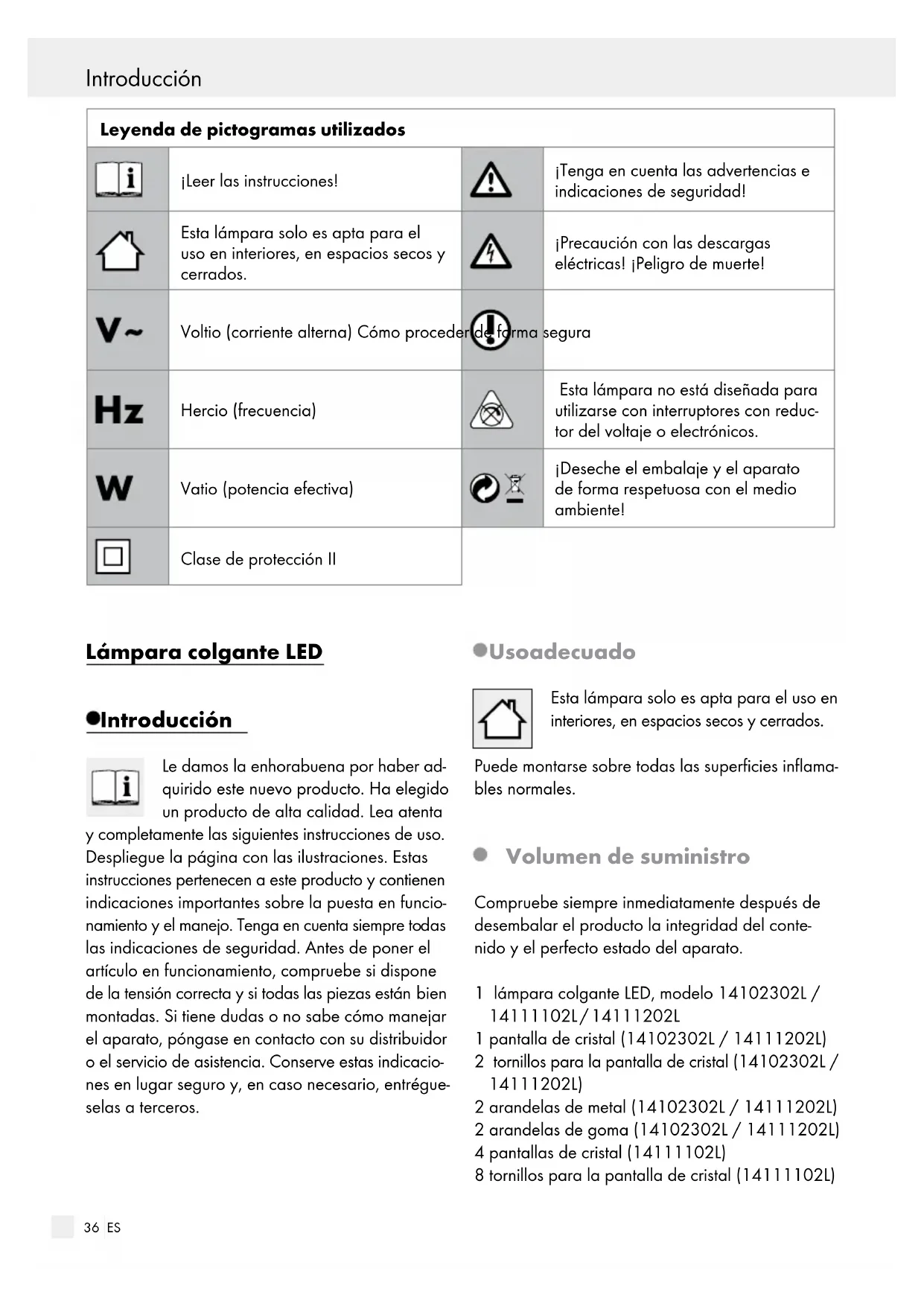 Tornillo hexagonal interior Datos técnicos Nº de artículo: 14102302L / 14111102L / 14111202L Tensión de funcionamiento: 230–240 V∼ 50 Hz Potencia nominal bombilla: 22 vatios Iluminación: 4 x 5,5 W módulos LED (bombillas LED no intercambiables) Factor de rendimiento/ corriente nominal por cada módulo LED: 0,506 / 174 mA Clase de protección: II / Clase de aislamiento: IP20 Seguridad Indicaciones de seguridad ¡El derecho de garantía quedará anulado en caso de producirse daños por no tener en cuenta estas instrucciones de uso! ¡No se asumirá responsabilidad alguna por daños indirectos! En caso de que el manejo inadecuado del producto o el incumpli miento de las indicaciones de seguridad provoquen daños materiales o personales, ¡no se asumirá ninguna responsabilidad! Únicamente deben utilizarse las piezas suministradas, ya que en caso contrario se perderán los correspondientes derechos de garantía. Este producto puede ser utilizado por niños mayores de 8 años, así como por personas con capacidades físicas, sensoriales o mentales re- ducidas o que cuenten con poca experiencia y / o falta de conocimientos, siempre y cuando se les haya enseñado cómo utilizar el aparato de forma segura y hayan comprendido los pe- ligros que pueden resultar de un mal uso del mismo. No permita que los niños jueguen con el aparato. La limpieza y mantenimiento no de- ben llevarse a cabo por niños sin la vigilancia de un adulto. Cuidado, peligro de descarga eléctrica La instalación eléctrica la debe realizar un elec- tricista formado o una persona instruida en ins- talaciones eléctricas. No se asume ninguna responsabilidad en caso de daños materiales o personales provocados por un uso inadecuado o la inobservancia de las instrucciones de seguridad. Nunca utilice la lámpara si ha detectado algún tipo de daño. Antes del montaje, retire el fusible o desconecte el interruptor automático de la caja de fusibles (posición 0). Evite que la lámpara entre en contacto con agua u otros líquidos.38 ES Seguridad / Preparativos / Puesta en funcionamiento Asegúrese antes de cada montaje de que la corriente nominal disponible coincida con la tensión de funcionamiento necesaria de la lám- para (230–240 V∼). Asegúrese de que durante el montaje ningún cable resulta dañado. Cómo prevenir incendios y lesiones Asegúrese de que la lámpara está apagada y se ha enfriado antes de tocarla para evitar quemaduras. No fije la lámpara sobre suelos húmedos o conductores. No deje la lámpara ni el material de embalaje sin supervisión. Las láminas y bolsas de plás- tico, las piezas de plástico, etc. pueden conver- tirse en juguetes peligrosos para los niños. No mire directamente al foco de luz (bombilla, LED, etc.). No mirar a la fuente de luz con instrumentos ópticos. Cómo proceder de forma segura Monte la lámpara de modo que esté protegida de la humedad, la suciedad y de temperaturas demasiado elevadas. ¡Proceda siempre con sumo cuidado! Preste mu- cha atención a lo que hace y actúe siempre con sentido común. Bajo ningún concepto utilice la lámpara si está distraído o no se encuentra bien. Familiarícese con la lámpara y con las indica- ciones e ilustraciones de este manual antes de utilizarla. Esta lámpara no está diseñada para utilizarse con interruptores con reductor del voltaje o electrónicos. La fuente de iluminación de esta lámpara no es reemplazable, si esta llega al final de su vida útil deberá reemplazar la lámpara por completo. ¡PELIGRO DE CORTOCIRCUITO! Asegú- rese de no tocar los cables durante el funcionamiento del producto. Esto podría cau- sar daños en la lámpara. Preparativos Herramientas y materiales necesarios Las herramientas y los materiales mencionados no se incluyen en el volumen de suministro. Los valores y datos tratados son aproximados y meramente orientativos. Los materiales necesarios dependerán de las circunstancias particulares de cada situación. - Lápiz / herramienta de marcación - Comprobador de tensión - Destornillador - Taladro - Broca (aprox. ø 6 mm) - Alicates - Escalera Puesta en funcionamiento Cómo montar la lámpara