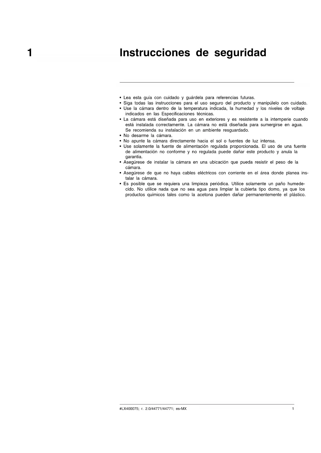 ELÉCTRICO NO ABRIR ADVERTENCIA: PARA REDUCIR EL RIESGO DE DESCARGA ELÉCTRICA, NO QUITE LA TAPA. NO CONTIENE PARTES SUJETAS A MANTENIMIENTO. EL SERVICIO DE MANTENIMIENTO DEBE ESTAR A CARGO DE PERSONAL CALIFICADO. El símbolo del rayo con la punta en flecha dentro de un triángulo equilátero pretende alertar al usuario sobre la presencia de un "voltaje peligroso" sin aislación dentro de la carcasa del producto, que puede ser de tal magnitud que suponga un riesgo de choque eléctrico. El signo de exclamación dentro de un triángulo equilátero pretende alertar al usuario sobre la presencia de instrucciones de mantenimiento (servicio) y operación importantes en la literatura que acompaña al dispositivo. ADVERTENCIA: PARA EVITAR EL PELIGRO DE INCENDIO O CHOQUE, NO EXPONGA ESTA UNIDAD A LA LLUVIA O LA HUMEDAD. PRECAUCIÓN: PARA EVITAR CHOQUES ELÉCTRICOS, CONECTE LA PATA ANCHA DEL ENCHUFE A LA RANURA ANCHA E INSÉRTELA COMPLETAMENTE. #LX400075; r. 2.0/44771/44771; es-MX ivTabla de contenido 1 Instrucciones de seguridad ..................................................................1 2 Instrucciones iniciales .........................................................................2 3 Cómo conectar la cámara.....................................................................3