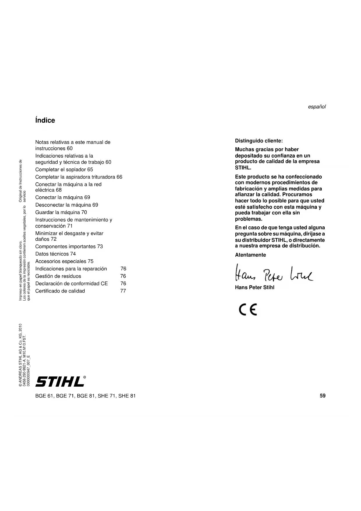 Índice Distinguido cliente: Muchas gracias por haber depositado su confianza en un producto de calidad de la empresa STIHL. Este producto se ha confeccionado con modernos procedimientos de fabricación y amplias medidas para afianzar la calidad. Procuramos hacer todo lo posible para que usted esté satisfecho con esta máquina y pueda trabajar con ella sin problemas. En el caso de que tenga usted alguna pregunta sobre su máquina, diríjase a su distribuidor STIHL, o directamente a nuestra empresa de distribución. Atentamente Hans Peter Stihl Notas relativas a este manual de instrucciones 60 Indicaciones relativas a la seguridad y técnica de trabajo 60 Completar el soplador 65 Completar la aspiradora trituradora 66 Conectar la máquina a la red eléctrica 68 Conectar la máquina 69 Desconectar la máquina 69 Guardar la máquina 70 Instrucciones de mantenimiento y conservación 71 Minimizar el desgaste y evitar daños 72 Componentes importantes 73 Datos técnicos 74 Accesorios especiales 75 Indicaciones para la reparación 76 Gestión de residuos 76 Declaración de conformidad CE 76 Certificado de calidad 77BGE 61, BGE 71, BGE 81, SHE 71, SHE 81 español
