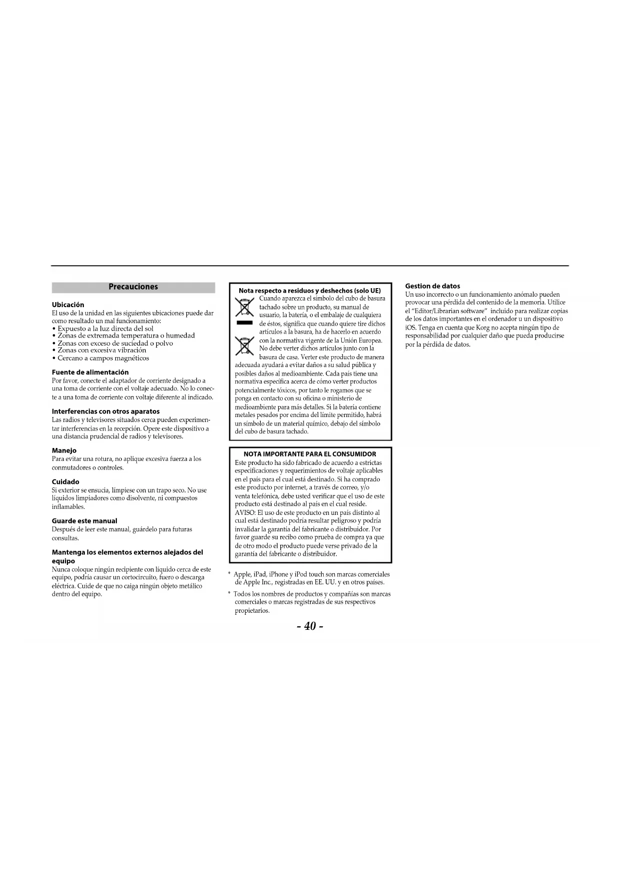 - Todos los nombres de productos y compañías son marcas comerciales o marcas registradas de sus respectivos propietarios. Gestion de datos Un uso incorrecto o un funcionamiento anómalo pueden provocar una pérdida del contenido de la memoria. Utilice el “Editor/Librarian software” incluido para realizar copias de los datos importantes en el ordenador u un dispositivo iOS. Tenga en cuenta que Korg no acepta ningún tipo de responsabilidad por cualquier daño que pueda producirse por la pérdida de datos.- 41 - VT20X/VT40X Manual de usuario Manual de usuario Características principales