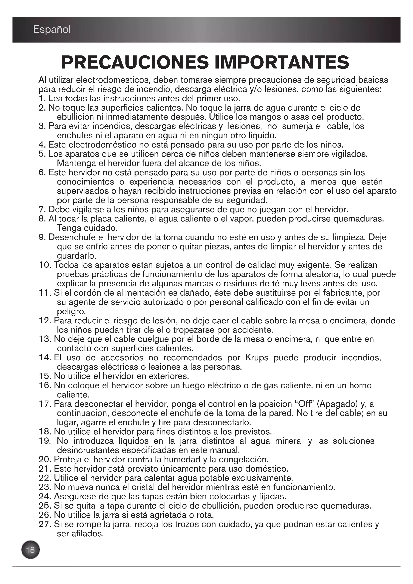 KR-KETTLE-FL700_NC00111205 26/03/13 16:22 Page17PRECAUCIONES IMPORTANTES Al utilizar electrodomésticos, deben tomarse siempre precauciones de seguridad básicas para reducir el riesgo de incendio, descarga eléctrica y/o lesiones, como las siguientes: