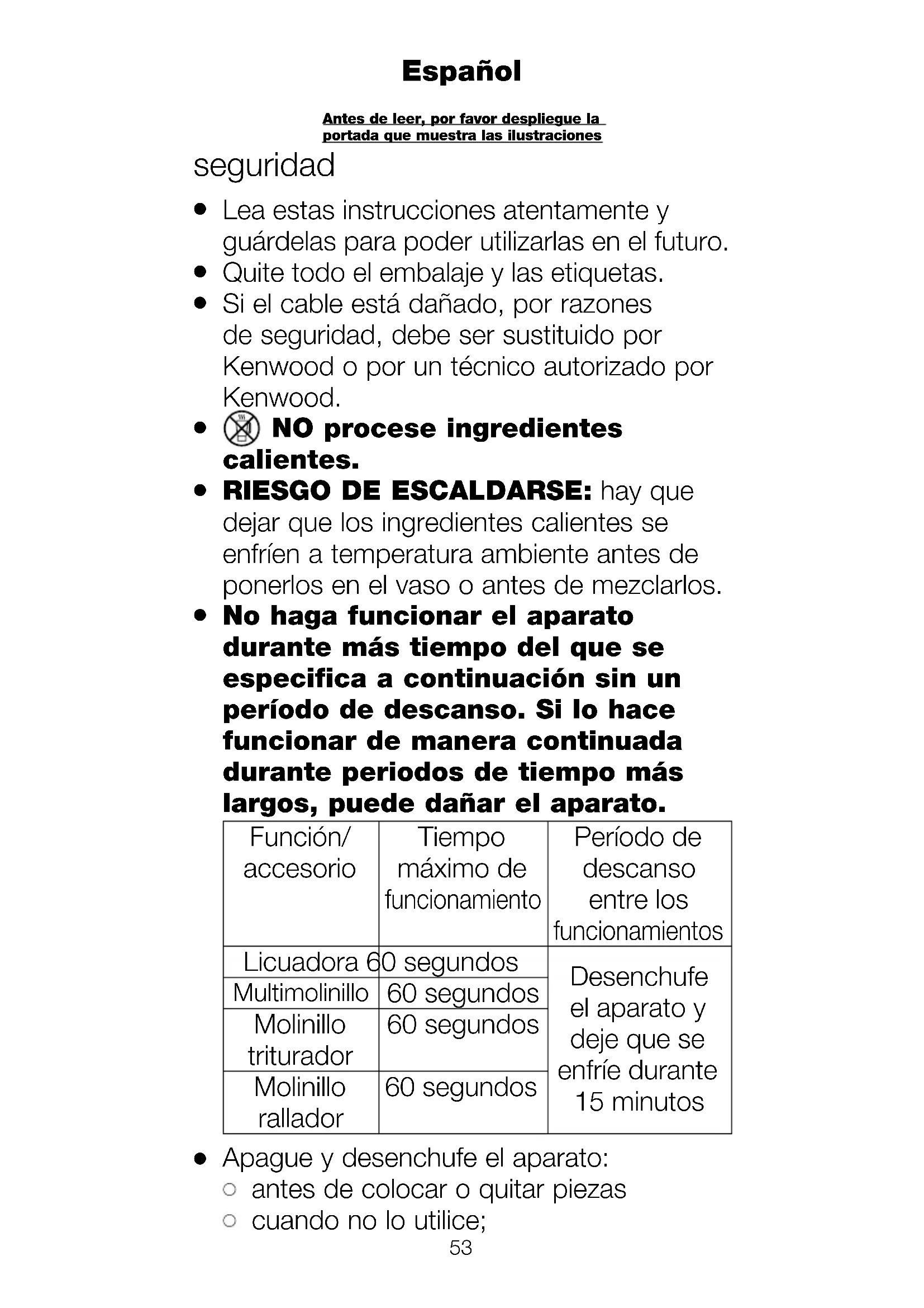Apague y desenchufe el aparato: antes de colocar o quitar piezas cuando no lo utilice; Español Antes de leer, por favor despliegue la portada que muestra las ilustraciones53 54 antes de limpiarlo.