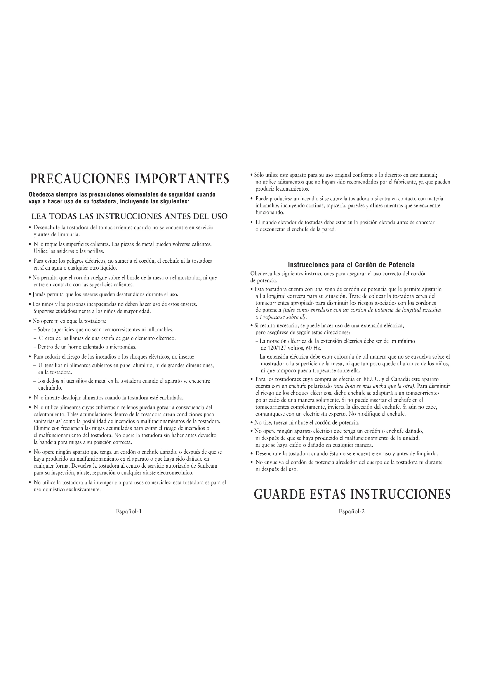 - No opere ningún aparato queonga un cordón o enchufe dañado, o aprèsix de que se haya producido un malfunctionamento en el aparato o que haya sido dañado enequalquier forma. Devuela la tostadora al centro de servicios autorizado de Sunbcam para su inspections, ajuste, reparación oequalquier ajuste electromécnico.