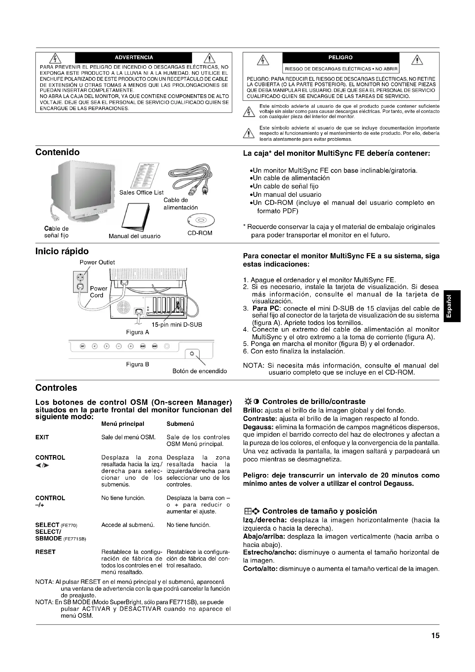NOTA: Si necesita más información, consulte el manual del usuario completo que se incluye en el CD-ROM. Inicio rápido Controles de brillo/contraste Brillo: ajusta el brillo de la imagen global y del fondo. Contraste: ajusta el brillo de la imagen respecto al fondo. Degauss: elimina la formación de campos magnéticos dispersos, que impiden el barrido correcto del haz de electrones y afectan a la pureza de los colores, el enfoque y la convergencia de la pantalla. Una vez activada la pantalla, la imagen saltará y parpadeará un poco mientras se desmagnetiza. Peligro: deje transcurrir un intervalo de 20 minutos como mínimo antes de volver a utilizar el control Degauss. Controles de tamaño y posición Izq./derecha: desplaza la imagen horizontalmente (hacia la izquierda o hacia la derecha). Abajo/arriba: desplaza la imagen verticalmente (hacia arriba o hacia abajo). Estrecho/ancho: disminuye o aumenta el tamaño horizontal de la imagen. Corto/alto: disminuye o aumenta el tamaño vertical de la imagen. Controles Los botones de control OSM (On-screen Manager) situados en la parte frontal del monitor funcionan del siguiente modo: EXIT CONTROLCONTROL SELECT (FE770)SELECT/SBMODE (FE771SB)RESETMenú principalSale del menú OSM.Desplaza la zonaresaltada hacia la izq./derecha para selec-cionar uno de lossubmenús.No tiene función.Accede al submenú.Restablece la configu-ración de fábrica detodos los controles en elmenú resaltado.SubmenúSale de los controlesOSM Menú principal.Desplaza la zonaresaltada hacia laizquierda/derecha paraseleccionar uno de loscontroles.Desplaza la barra con –o + para reducir oaumentar el ajuste.No tiene función.Restablece la configura-ción de fábrica del con-trol resaltado.NOTA: Al pulsar RESET en el menú principal y el submenú, apareceráuna ventana de advertencia con la que podrá cancelar la funciónde preajuste.NOTA: En SB MODE (Modo SuperBright, sólo para FE771SB), se puedepulsar ACTIVAR y DESACTIVAR cuando no aparece elmenú OSM.RIESGO DE DESCARGAS ELÉCTRICAS • NO ABRIRFigura AFigura BBotón de encendido