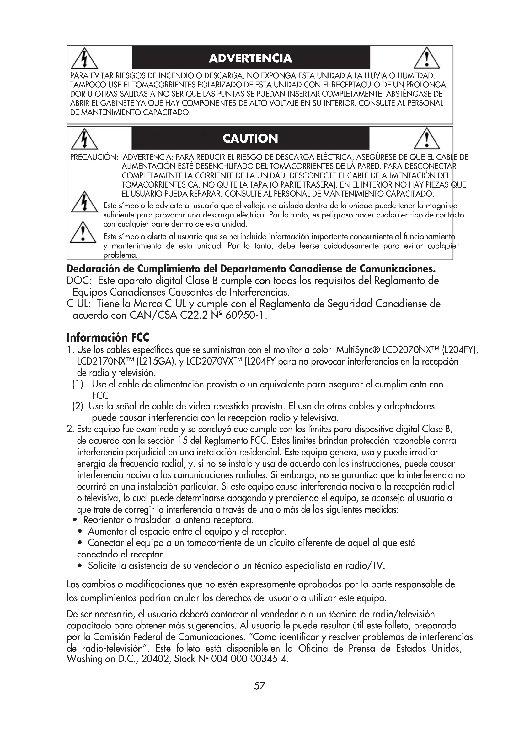 , NEC Display Solutions of America, Inc. a veillé à ce que ce produit respecte les normes EnErgy Star en matière de rendement énergétique. Le logo EnErgy Star ne représente aucun aval par l’EPA de quelque produit ou service que ce soit. Série LCD NEC57 PRECAUCIÓN: ADVERTENCIA: PARA REDUCIR EL RIESGO DE DESCARGA ELÉCTRICA, ASEGÚRESE DE QUE EL CABLE DE ALIMENTACIÓN ESTÉ DESENCHUFADO DEL TOMACORRIENTES DE LA PARED. PARA DESCONECTAR COMPLETAMENTE LA CORRIENTE DE LA UNIDAD, DESCONECTE EL CABLE DE ALIMENTACIÓN DEL TOMACORRIENTES CA. NO QUITE LA TAPA (O PARTE TRASERA). EN EL INTERIOR NO HAY PIEZAS QUE EL USUARIO PUEDA REPARAR. CONSULTE AL PERSONAL DE MANTENIMIENTO CAPACITADO. Este símbolo le advierte al usuario que el voltaje no aislado dentro de la unidad puede tener la magnitud suficiente para provocar una descarga eléctrica. Por lo tanto, es peligroso hacer cualquier tipo de contacto con cualquier parte dentro de esta unidad. Este símbolo alerta al usuario que se ha incluido información importante concerniente al funcionamiento y mantenimiento de esta unidad. Por lo tanto, debe leerse cuidadosamente para evitar cualquier problema. ADVERTENCIA CAUTION Declaración de Cumplimiento del Departamento Canadiense de Comunicaciones. DOC: Este aparato digital Clase B cumple con todos los requisitos del Reglamento de Equipos Canadienses Causantes de Interferencias. C-UL: Tiene la Marca C-UL y cumple con el Reglamento de Seguridad Canadiense de acuerdo con CAN/CSA C22.2 Nº 60950-1. Información FCC