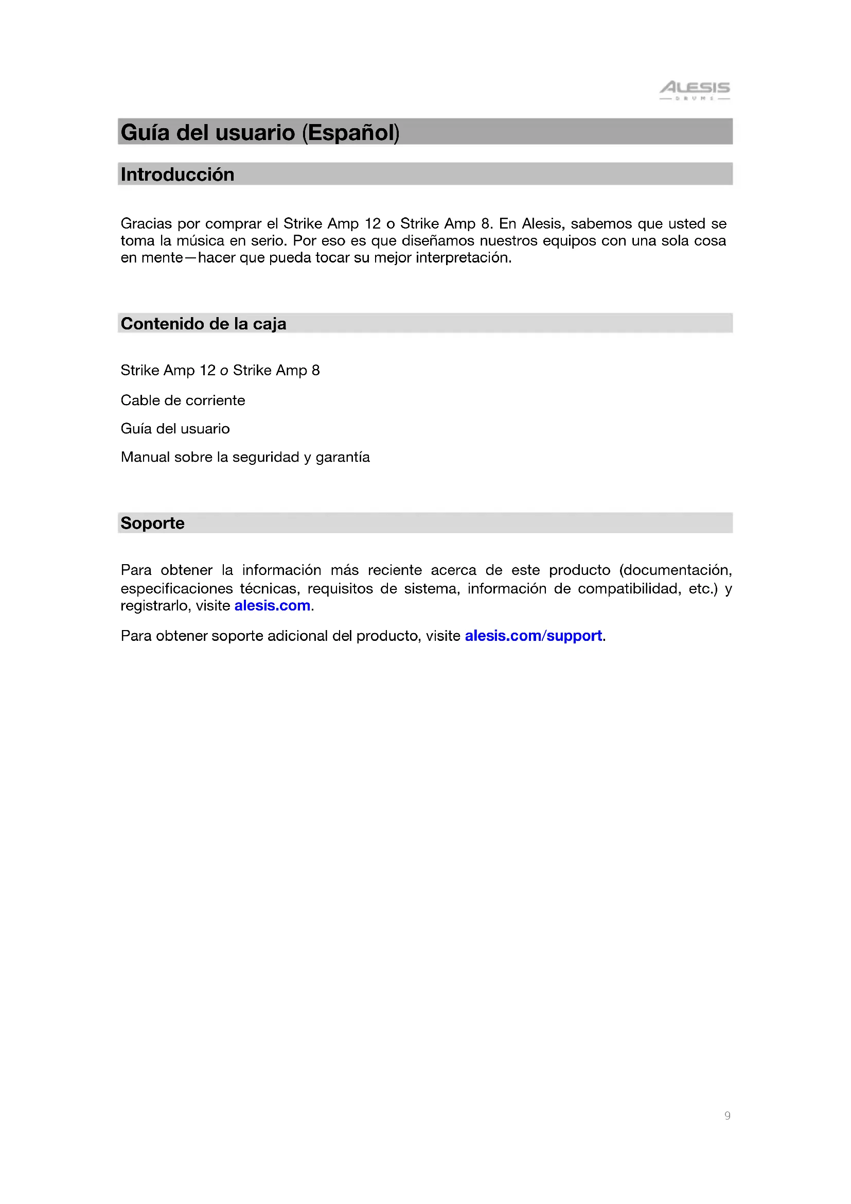 Guía del usuario (Español) Introducción Gracias por comprar el Strike Amp 12 o Strike Amp 8. En Alesis, sabemos que usted se toma la música en serio. Por eso es que diseñamos nuestros equipos con una sola cosa en mente—hacer que pueda tocar su mejor interpretación.