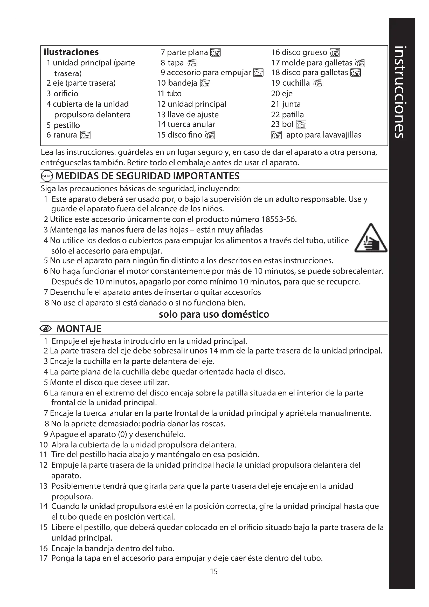 Siga las precauciones básicas de seguridad, incluyendo: 1 Este aparato deberá ser usado por, o bajo la supervisión de un adulto responsable. Use y guarde el aparato fuera del alcance de los niños. 2 Utilice este accesorio únicamente con el producto número 18553-56. 3 Mantenga las manos fuera de las hojas – están muy afiladas 4 No utilice los dedos o cubiertos para empujar los alimentos a través del tubo, utilice sólo el accesorio para empujar. 5 No use el aparato para ningún fin distinto a los descritos en estas instrucciones. 6 No haga funcionar el motor constantemente por más de 10 minutos, se puede sobrecalentar. Después de 10 minutos, apagarlo por como mínimo 10 minutos, para que se recupere. 7 Desenchufe el aparato antes de insertar o quitar accesorios 8 No use el aparato si está dañado o si no funciona bien. solo para uso doméstico C MONTAJE 1 Empuje el eje hasta introducirlo en la unidad principal. 2 La parte trasera del eje debe sobresalir unos 14 mm de la parte trasera de la unidad principal. 3 Encaje la cuchilla en la parte delantera del eje. 4 La parte plana de la cuchilla debe quedar orientada hacia el disco. 5 Monte el disco que desee utilizar. 6 La ranura en el extremo del disco encaja sobre la patilla situada en el interior de la parte frontal de la unidad principal. 7 Encaje la tuerca anular en la parte frontal de la unidad principal y apriétela manualmente. 8 No la apriete demasiado; podría dañar las roscas. 9 Apague el aparato () y desenchúfelo. 10 Abra la cubierta de la unidad propulsora delantera. 11 Tire del pestillo hacia abajo y manténgalo en esa posición. 12 Empuje la parte trasera de la unidad principal hacia la unidad propulsora delantera del aparato. 13 Posiblemente tendrá que girarla para que la parte trasera del eje encaje en la unidad propulsora. 14 Cuando la unidad propulsora esté en la posición correcta, gire la unidad principal hasta que el tubo quede en posición vertical. 15 Libere el pestillo, que deberá quedar colocado en el orificio situado bajo la parte trasera de la unidad principal. 16 Encaje la bandeja dentro del tubo. 17 Ponga la tapa en el accesorio para empujar y deje caer éste dentro del tubo. instrucciones ilustraciones 1 unidad principal (parte trasera) 2 eje (parte trasera) 3 orificio 4 cubierta de la unidad propulsora delantera 5 pestillo 6 ranura ` 7 parte plana ` 8 tapa ` 9 accesorio para empujar ` 10 bandeja ` 11 tubo 12 unidad principal 13 llave de ajuste 14 tuerca anular 15 disco fino ` 16 disco grueso ` 17 molde para galletas ` 18 disco para galletas ` 19 cuchilla ` 20 eje 21 junta 22 patilla 23 bol ` ` apto para lavavajillas16 18 Coloque el bol bajo el extremo de la picadora para recoger la carne picada. 19 El bol puesto boca abajo puede utilizarse para tapar la bandeja.