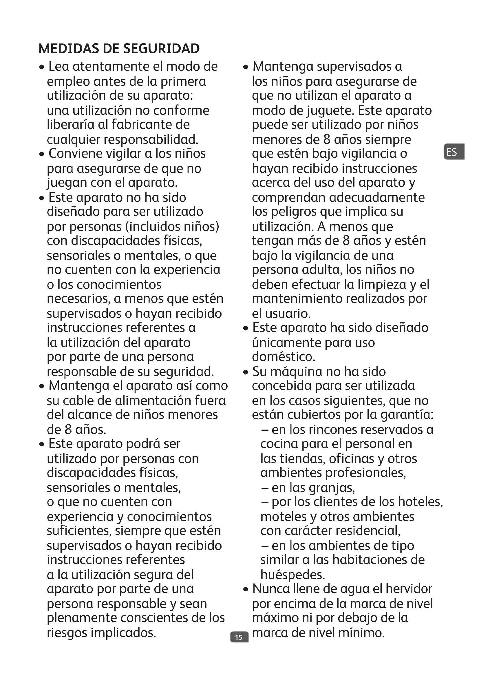 - Este aparato no ha sido diseñado para ser utilizado por personas (incluidos niños) con discapacidades físicas, sensoriales o mentales, o que no cuenten con la experiencia o los conocimientos necesarios, a menos que estén supervisados o hayan recibido instrucciones referentes a la utilización del aparato por parte de una persona responsable de su seguridad.