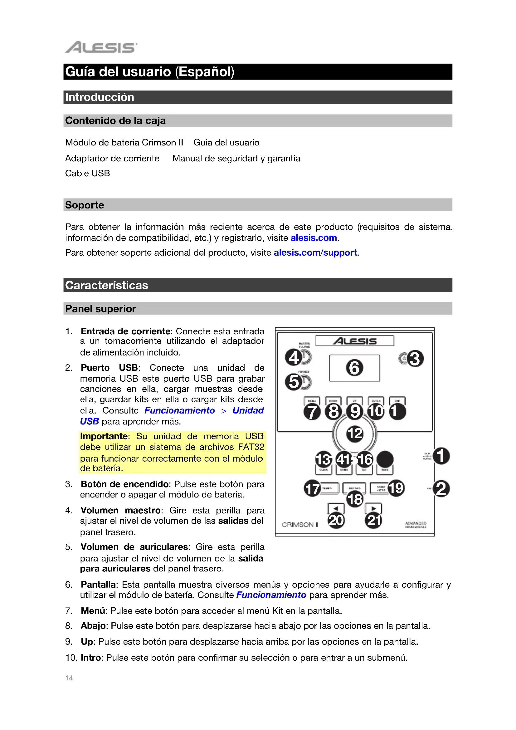 Guía del usuario (Español) Introducción Contenido de la caja Módulo de batería Crimson II Guía del usuario Adaptador de corriente Manual de seguridad y garantía Cable USB Soporte Para obtener la información más reciente acerca de este producto (requisitos de sistema, información de compatibilidad, etc.) y registrarlo, visite alesis.com. Para obtener soporte adicional del producto, visite alesis.com/support. Características Panel superior