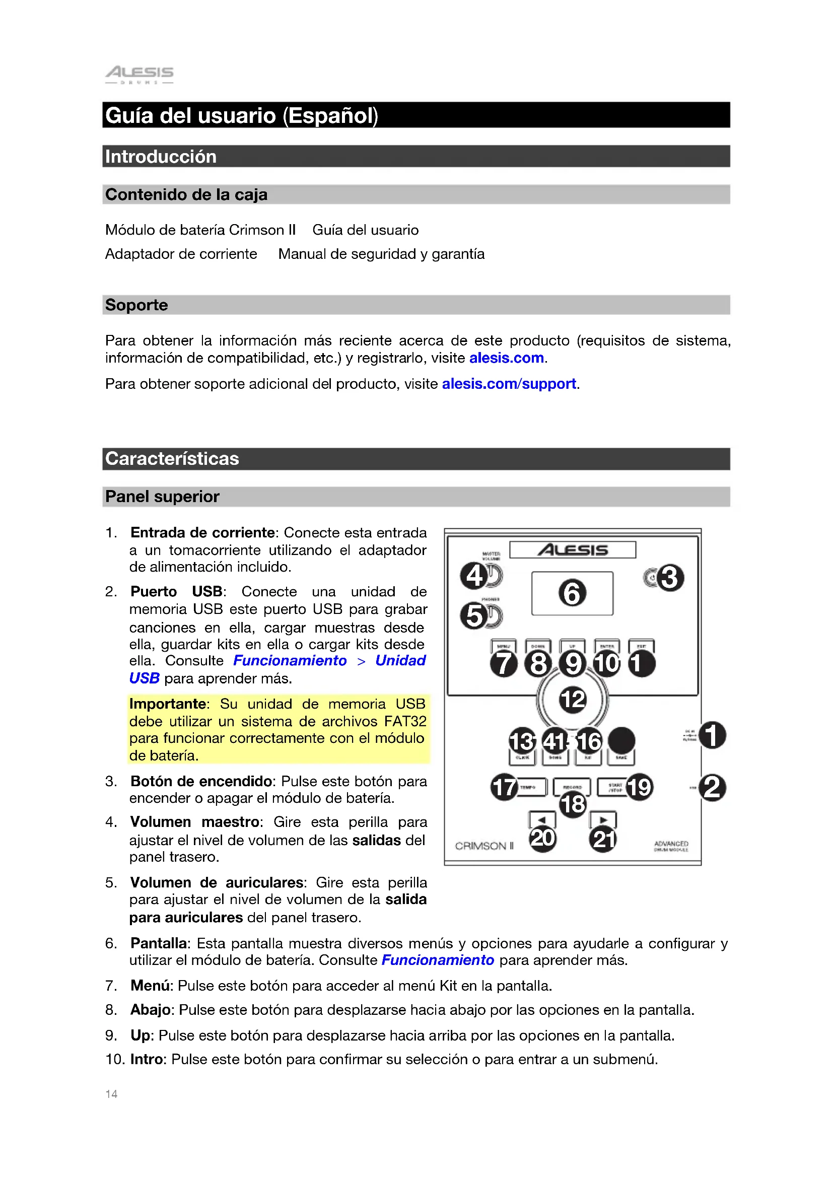 Guía del usuario (Español) Introducción Contenido de la caja Módulo de batería Crimson II Guía del usuario Adaptador de corriente Manual de seguridad y garantía Soporte Para obtener la información más reciente acerca de este producto (requisitos de sistema, información de compatibilidad, etc.) y registrarlo, visite alesis.com. Para obtener soporte adicional del producto, visite alesis.com/support.