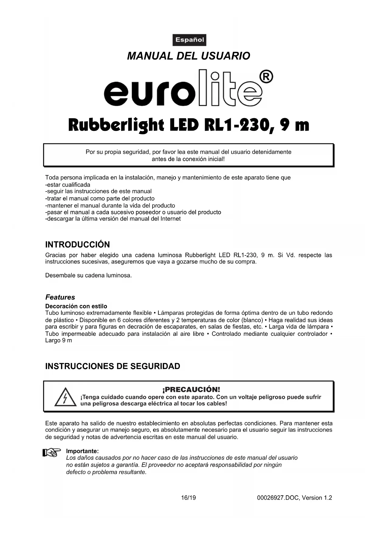 Rubberlight LED RL1-230, 9 m Por su propia seguridad, por favor lea este manual del usuario detenidamenteantes de la conexión inicial!Toda persona implicada en la instalación, manejo y mantenimiento de este aparato tiene que-estar cualificada-seguir las instrucciones de este manual-tratar el manual como parte del producto-mantener el manual durante la vida del producto-pasar el manual a cada sucesivo poseedor o usuario del producto-descargar la última versión del manual del Internet INTRODUCCIÓN Gracias por haber elegido una cadena luminosa Rubberlight LED RL1-230, 9 m. Si Vd. respecte las instrucciones sucesivas, aseguremos que vaya a gozarse mucho de su compra.Desembale su cadena luminosa. Features Decoración con estiloTubo luminoso extremadamente flexible • Lámparas protegidas de forma óptima dentro de un tubo redondode plástico • Disponible en 6 colores diferentes y 2 temperaturas de color (blanco) • Haga realidad sus ideaspara escribir y para figuras en decración de escaparates, en salas de fiestas, etc. • Larga vida de lámpara • Tubo impermeable adecuado para instalación al aire libre • Controlado mediante cualquier controlador • Largo 9 m