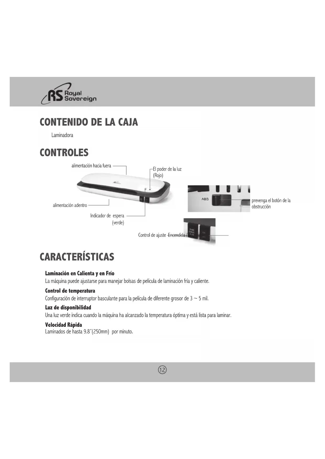 Laminadora CONTROLES CARACTERÍSTICAS Laminación en Calienta y en Frío La máquina puede ajustarse para manejar bolsas de película de laminación fría y caliente. Control de temperatura Configuración de interruptor basculante para la película de diferente grosor de 3 ~ 5 mil. Luz de disponibilidad Una luz verde indica cuando la máquina ha alcanzado la temperatura óptima y está lista para laminar. Velocidad Rápida Laminados de hasta 9.8˝(250mm) por minuto. Indicador de espera (verde) El poder de la luz (Rojo) alimentación adentro alimentación hacia fuera prevenga el botón de la obstrucción Control de ajuste Encendida / ApagadoCS-923/1223