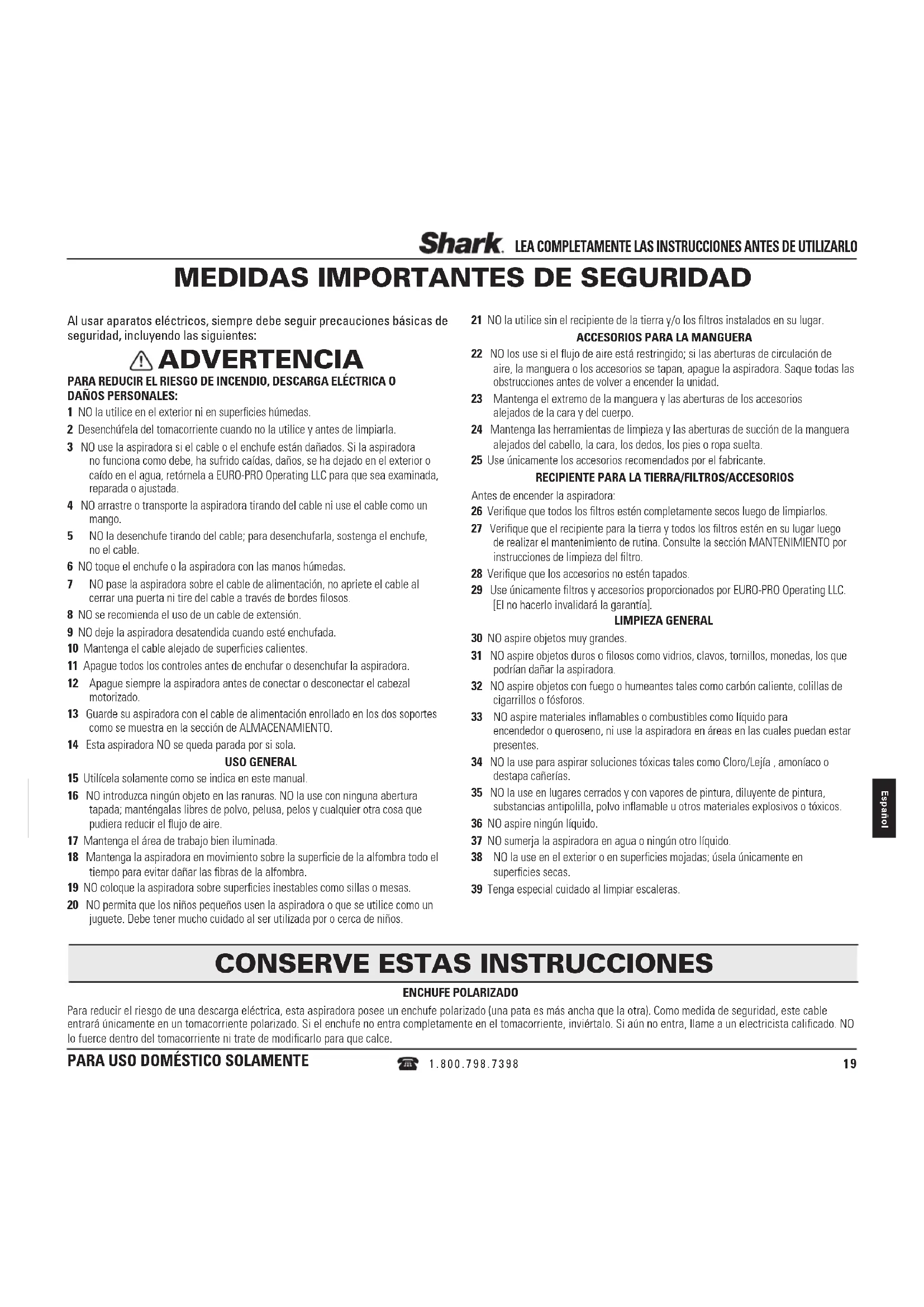 LEA COMPLETAMENTE LAS INSTRUCCIONES ANTES DE UTILIZARLO Al usar aparatos eléctricos, siempre debe seguir precauciones básicas de seguridad, incluyendo las siguientes: ADVERTENCIA PARA REDUCIR EL RIESGO DE INCENDIO, DESCARGA ELÉCTRICA O DAÑOS PERSONALES: 1 NO la utilice en el exterior ni en superficies húmedas. 2 Desenchúfela del tomacorriente cuando no la utilice y antes de limpiarla. 3 NO use la aspiradora si el cable o el enchufe están dañados. Si la aspiradora no funciona como debe, ha sufrido caídas, daños, se ha dejado en el exterior o caído en el agua, retórnela a EURO-PRO Operating LLC para que sea examinada, reparada o ajustada. 4 NO arrastre o transporte la aspiradora tirando del cable ni use el cable como un mango. 5 NO la desenchufe tirando del cable; para desenchufarla, sostenga el enchufe, no el cable. 6 NO toque el enchufe o la aspiradora con las manos húmedas. 7 NO pase la aspiradora sobre el cable de alimentación, no apriete el cable al cerrar una puerta ni tire del cable a través de bordes filosos. 8 NO se recomienda el uso de un cable de extensión. 9 NO deje la aspiradora desatendida cuando esté enchufada. 10 Mantenga el cable alejado de superficies calientes. 11 Apague todos los controles antes de enchufar o desenchufar la aspiradora. 12 Apague siempre la aspiradora antes de conectar o desconectar el cabezal motorizado. 13 Guarde su aspiradora con el cable de alimentación enrollado en los dos soportes como se muestra en la sección de ALMACENAMIENTO. 14 Esta aspiradora NO se queda parada por si sola. USO GENERAL 15 Utilícela solamente como se indica en este manual. 16 NO introduzca ningún objeto en las ranuras. NO la use con ninguna abertura tapada; manténgalas libres de polvo, pelusa, pelos y cualquier otra cosa que pudiera reducir el flujo de aire. 17 Mantenga el área de trabajo bien iluminada. 18 Mantenga la aspiradora en movimiento sobre la superficie de la alfombra todo el tiempo para evitar dañar las fibras de la alfombra. 19 NO coloque la aspiradora sobre superficies inestables como sillas o mesas. 20 NO permita que los niños pequeños usen la aspiradora o que se utilice como un juguete. Debe tener mucho cuidado al ser utilizada por o cerca de niños. 21 NO la utilice sin el recipiente de la tierra y/o los filtros instalados en su lugar.