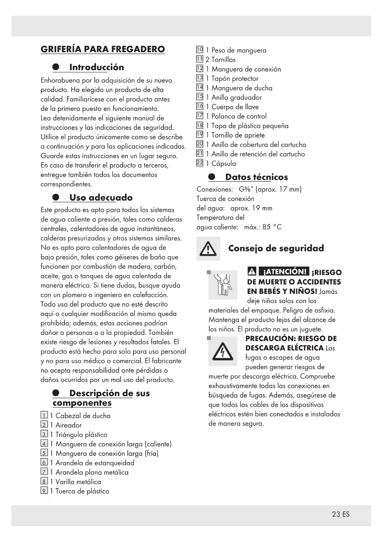 Introducción Enhorabuena por la adquisición de su nuevo producto. Ha elegido un producto de alta calidad. Familiarícese con el producto antes de la primera puesta en funcionamiento. Lea detenidamente el siguiente manual de instrucciones y las indicaciones de seguridad. Utilice el producto únicamente como se describe a continuación y para las aplicaciones indicadas. Guarde estas instrucciones en un lugar seguro. En caso de transferir el producto a terceros, entregue también todos los documentos correspondientes. Uso adecuado Este producto es apto para todos los sistemas de agua caliente a presión, tales como calderas centrales, calentadores de agua instantáneos, calderas presurizadas y otros sistemas similares. No es apto para calentadores de agua de baja presión, tales como géiseres de baño que funcionen por combustión de madera, carbón, aceite, gas o tanques de agua calentada de manera eléctrica. Si tiene dudas, busque ayuda con un plomero o ingeniero en calefacción. Todo uso del producto que no esté descrito aquí o cualquier modificación al mismo queda prohibida; además, estas acciones podrían dañar a personas o a la propiedad. También existe riesgo de lesiones y resultados fatales. El producto está hecho para solo para uso personal y no para uso médico o comercial. El fabricante no acepta responsabilidad ante pérdidas o daños ocurridos por un mal uso del producto. Descripción de sus componentes