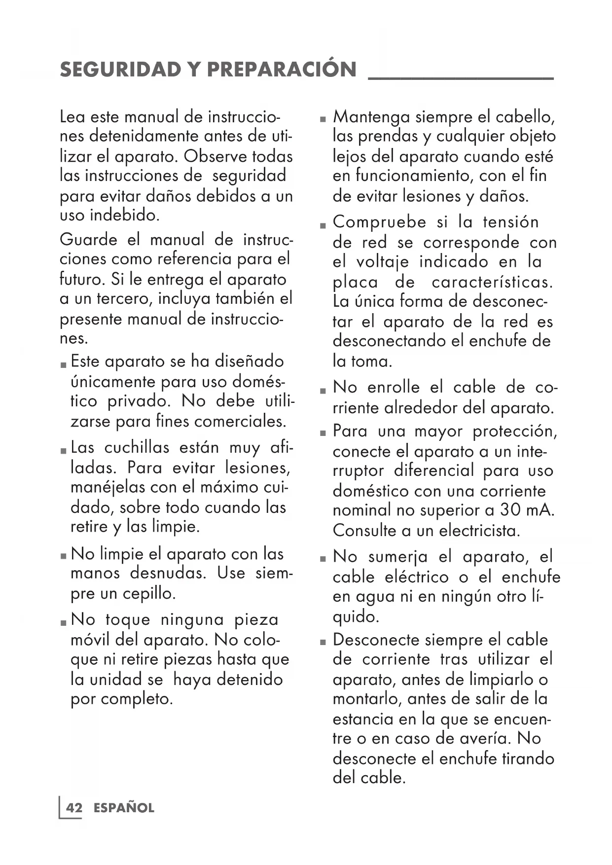 Desconecte siempre el cable de corriente tras utilizar el aparato, antes de limpiarlo o montarlo, antes de salir de la estancia en la que se encuen- tre o en caso de avería. No desconecte el enchufe tirando del cable.43 ESPAÑOL