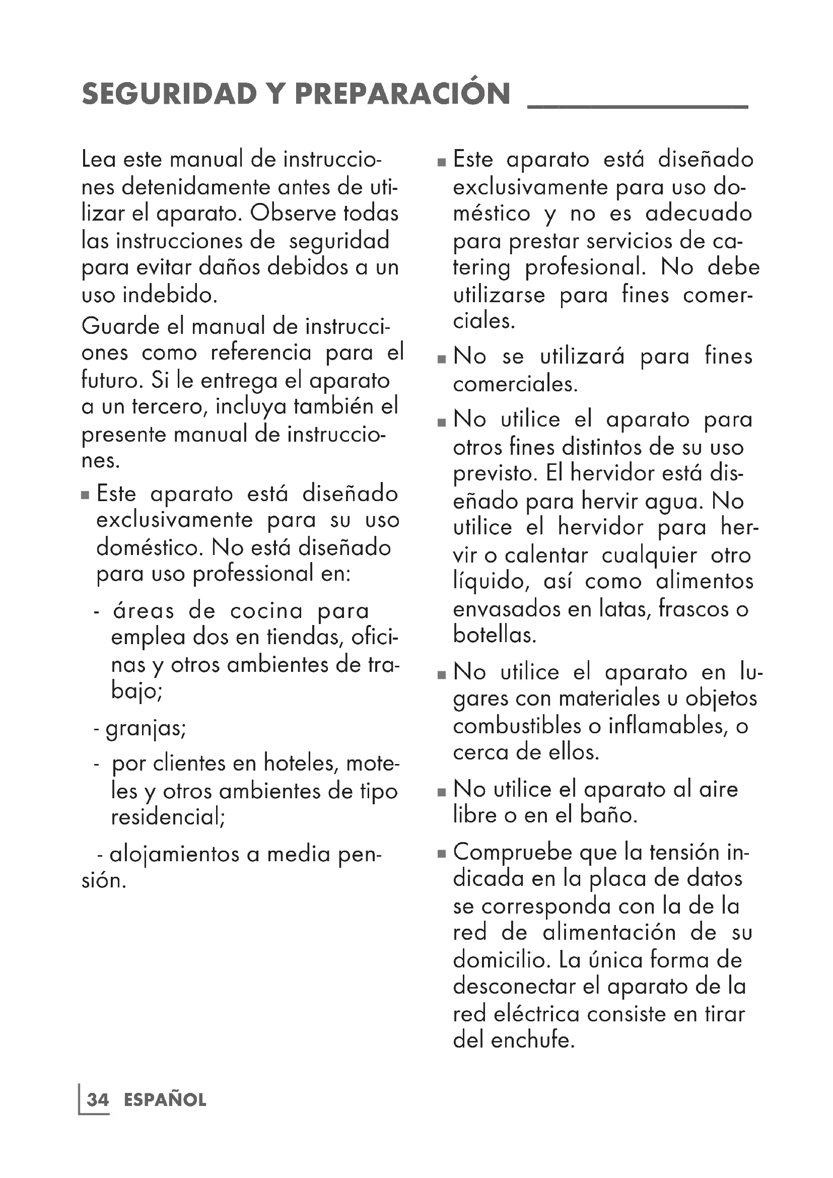 No utilice el aparato para otros fines distintos de su uso previsto. El hervidor está dis- eñado para hervir agua. No utilice el hervidor para her- vir o calentar cualquier otro líquido, así como alimentos envasados en latas, frascos o botellas.