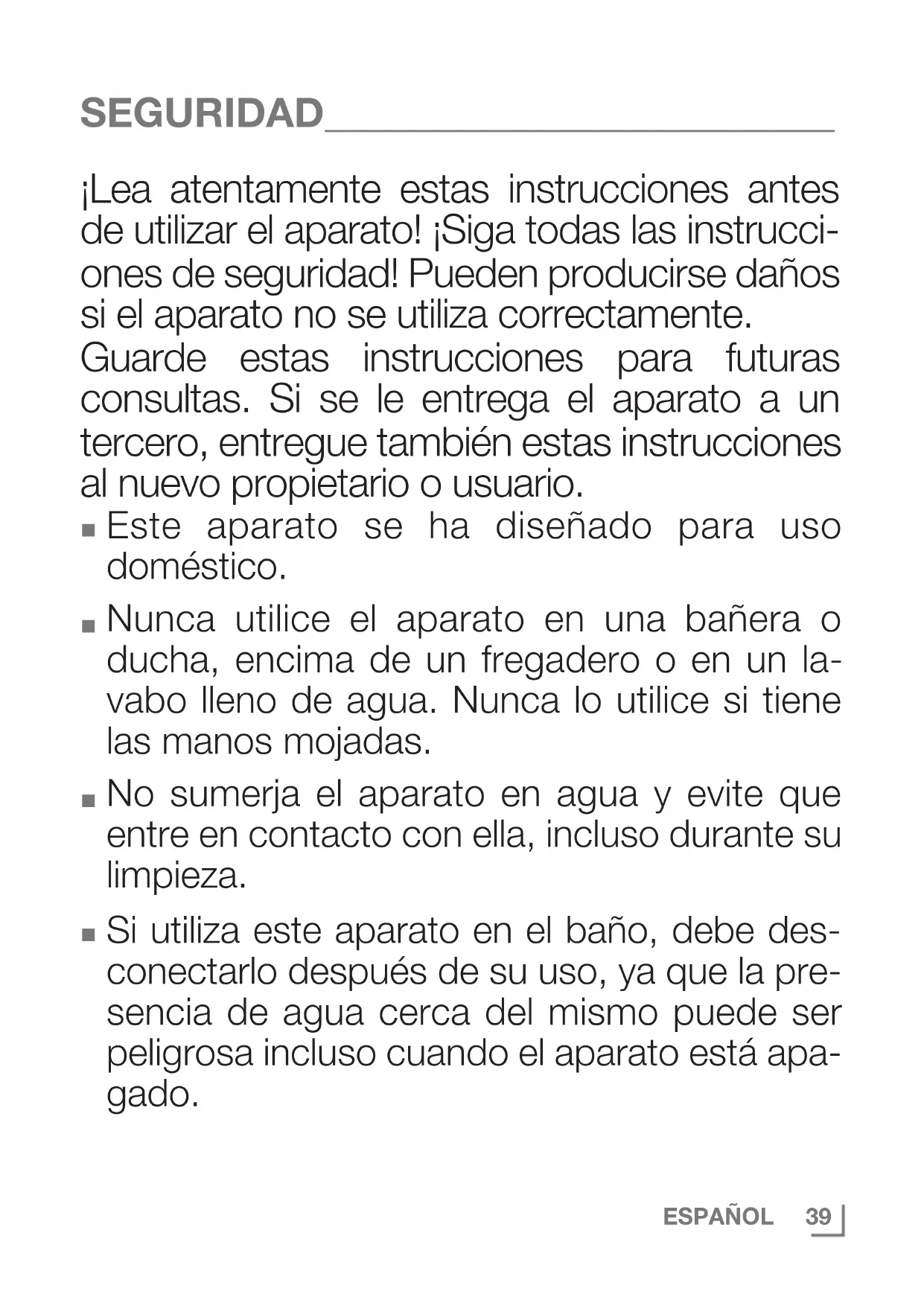 SEGURIDAD _________________________ ¡Lea atentamente estas instrucciones antes de utilizar el aparato! ¡Siga todas las instrucci- ones de seguridad! Pueden producirse daños si el aparato no se utiliza correctamente. Guarde estas instrucciones para futuras consultas. Si se le entrega el aparato a un tercero, entregue también estas instrucciones al nuevo propietario o usuario.