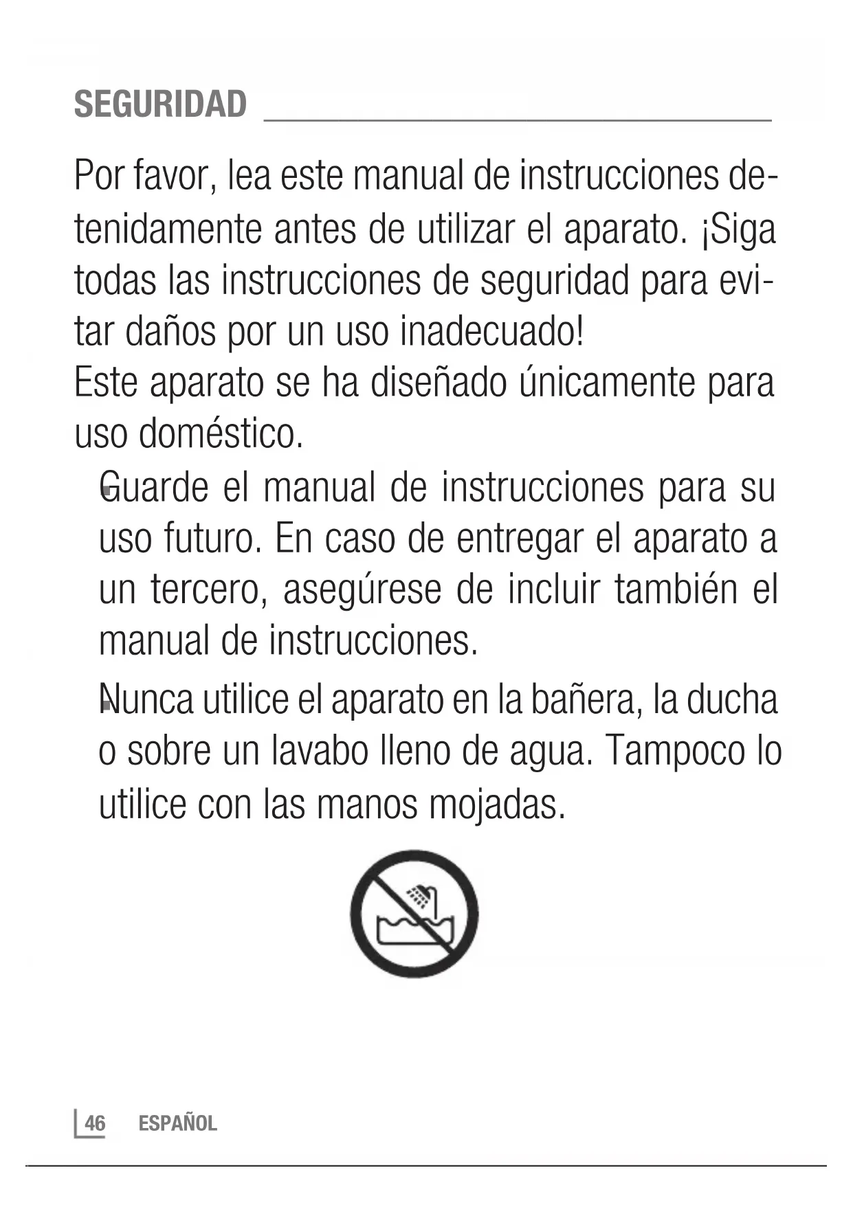 Nunca utilice el aparato en la bañera, la ducha o sobre un lavabo lleno de agua. Tampoco lo utilice con las manos mojadas.ESPAÑOL