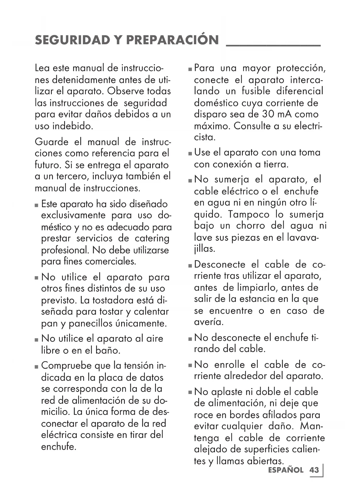 Lea este manual de instruccio- nes detenidamente antes de uti- lizar el aparato. Observe todas las instrucciones de seguridad para evitar daños debidos a un uso indebido. Guarde el manual de instruc- ciones como referencia para el futuro. Si se entrega el aparato a un tercero, incluya también el manual de instrucciones.