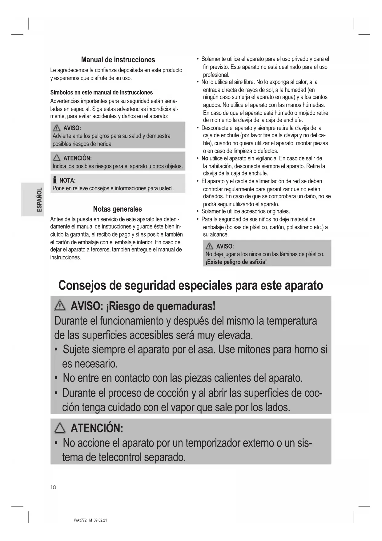 - Durante el proceso de cocción y al abrir las supercies de coc- ción tenga cuidado con el vapor que sale por los lados. ATENCIÓN: