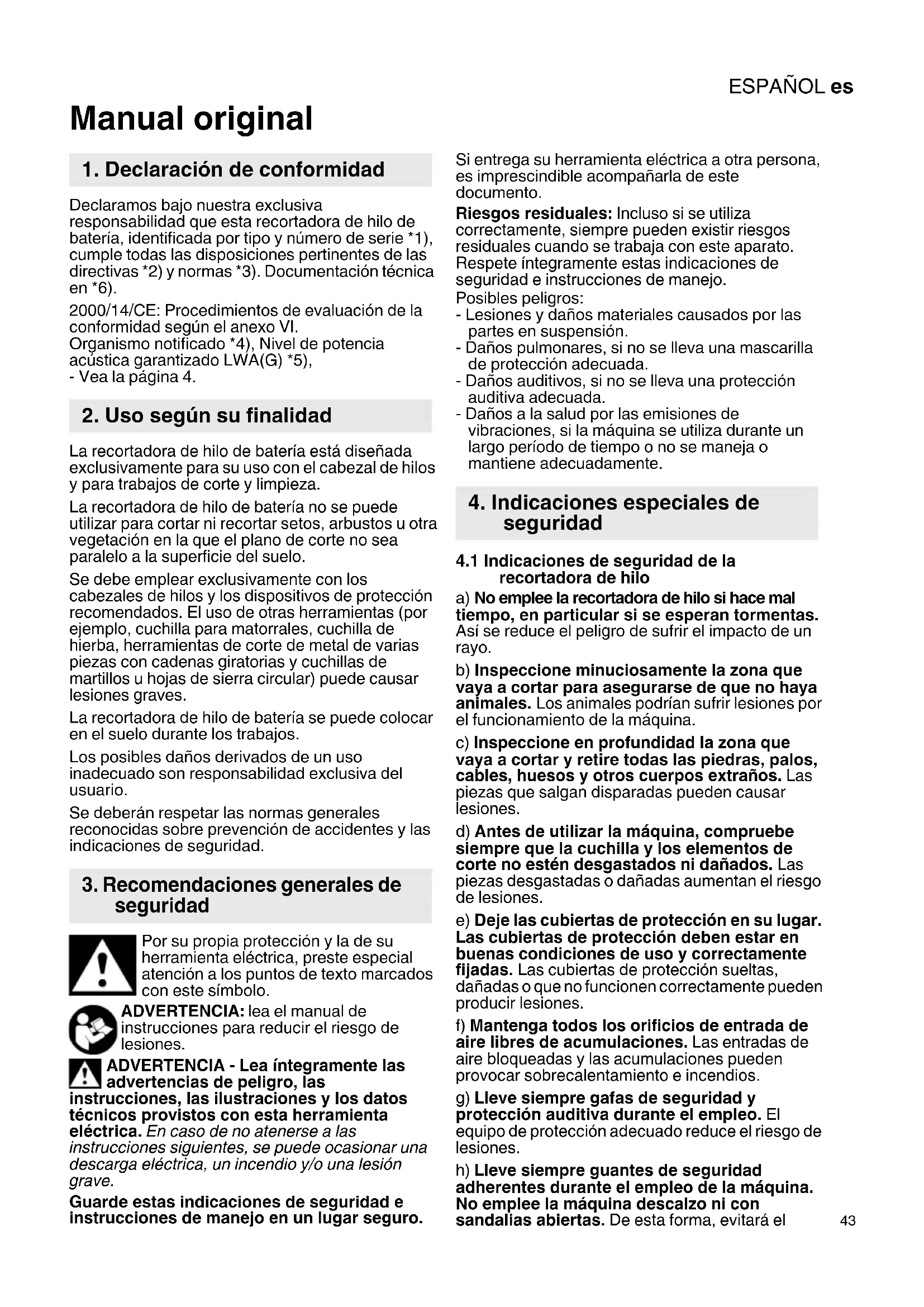 Manual original Declaramos bajo nuestra exclusiva responsabilidad que esta recortadora de hilo de batería, identificada por tipo y número de serie *1), cumple todas las disposiciones pertinentes de las directivas *2) y normas *3). Documentación técnica en *6). 2000/14/CE: Procedimientos de evaluación de la conformidad según el anexo VI. Organismo notificado *4), Nivel de potencia acústica garantizado LWA(G) *5), - Vea la página 4. La recortadora de hilo de batería está diseñada exclusivamente para su uso con el cabezal de hilos y para trabajos de corte y limpieza. La recortadora de hilo de batería no se puede utilizar para cortar ni recortar setos, arbustos u otra vegetación en la que el plano de corte no sea paralelo a la superficie del suelo. Se debe emplear exclusivamente con los cabezales de hilos y los dispositivos de protección recomendados. El uso de otras herramientas (por ejemplo, cuchilla para matorrales, cuchilla de hierba, herramientas de corte de metal de varias piezas con cadenas giratorias y cuchillas de martillos u hojas de sierra circular) puede causar lesiones graves. La recortadora de hilo de batería se puede colocar en el suelo durante los trabajos. Los posibles daños derivados de un uso inadecuado son responsabilidad exclusiva del usuario. Se deberán respetar las normas generales reconocidas sobre prevención de accidentes y las indicaciones de seguridad. Por su propia protección y la de su herramienta eléctrica, preste especial atención a los puntos de texto marcados con este símbolo. ADVERTENCIA: lea el manual de instrucciones para reducir el riesgo de lesiones. ADVERTENCIA - Lea íntegramente las advertencias de peligro, las instrucciones, las ilustraciones y los datos técnicos provistos con esta herramienta eléctrica. En caso de no atenerse a las instrucciones siguientes, se puede ocasionar una descarga eléctrica, un incendio y/o una lesión grave. Guarde estas indicaciones de seguridad e instrucciones de manejo en un lugar seguro. Si entrega su herramienta eléctrica a otra persona, es imprescindible acompañarla de este documento. Riesgos residuales: Incluso si se utiliza correctamente, siempre pueden existir riesgos residuales cuando se trabaja con este aparato. Respete íntegramente estas indicaciones de seguridad e instrucciones de manejo. Posibles peligros: - Lesiones y daños materiales causados por las partes en suspensión. - Daños pulmonares, si no se lleva una mascarilla de protección adecuada. - Daños auditivos, si no se lleva una protección auditiva adecuada. - Daños a la salud por las emisiones de vibraciones, si la máquina se utiliza durante un largo período de tiempo o no se maneja o mantiene adecuadamente.