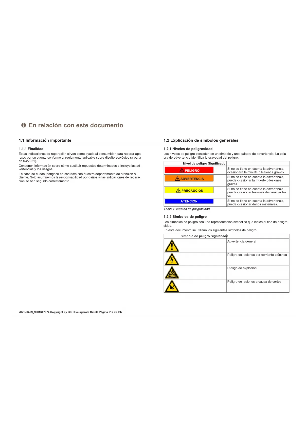 Los símbolos de peligro son una representación simbólica que indica el tipo de peligro- sidad. En este documento se utilizan los siguientes símbolos de peligro: Símbolo de peligro Significado Advertencia general Peligro de lesiones por corriente eléctrica Riesgo de explosión Peligro de lesiones a causa de cortes En relación con este documento 2021-06-09_9001647374 Copyright by BSH Hausgeräte GmbH Página612de697Símbolo de peligro Significado Peligro de lesiones por aplastamiento Peligro de lesiones por superficies calien- tes Peligro a causa de campos magnéticos de gran potencia Peligro derivado de radiación no ionizante Tabla2: Símbolos de peligro