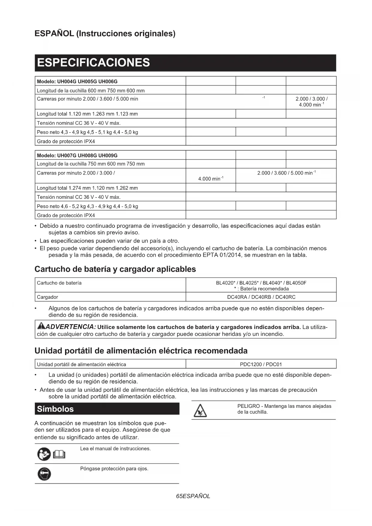 - Batería y cargador genuinos de Makita NOTA: Algunos elementos de la lista podrán estar incluidos en el paquete de la herramienta como acce- sorios estándar. Pueden variar de un país a otro.77 PORTUGUÊS PORTUGUÊS (Instruções originais) ESPECIFICAÇÕES Modelo: UH004G UH005G UH006G Comprimento da lâmina 600 mm 750 mm 600 mm Cursos por minuto 2.000 / 3.600 / 5.000 min