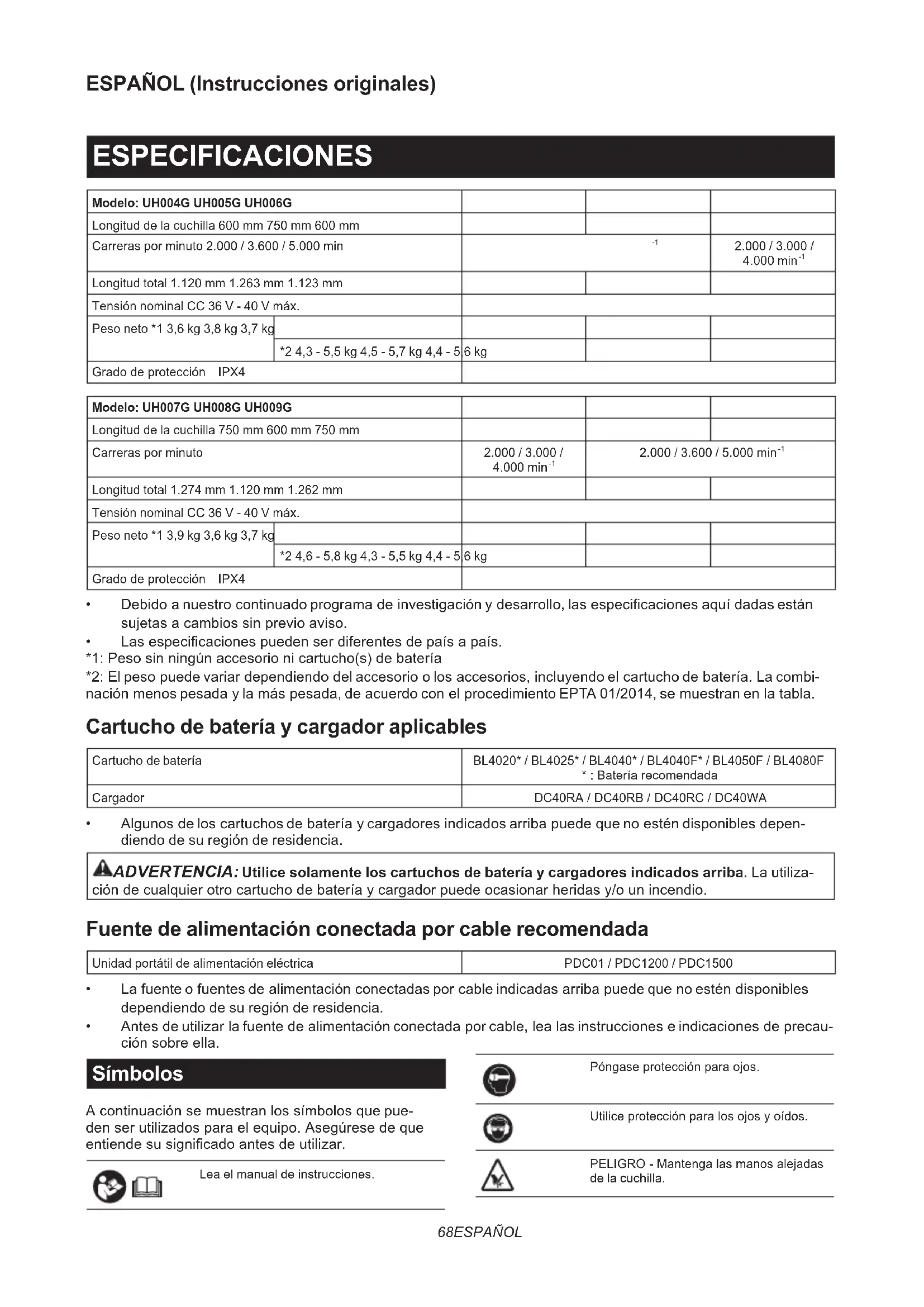 Longitud total 1.120 mm 1.263 mm 1.123 mm Tensión nominal CC 36 V - 40 V máx. Peso neto *1 3,6 kg 3,8 kg 3,7 kg *2 4,3 - 5,5 kg 4,5 - 5,7 kg 4,4 - 5,6 kg Gradodeprotección IPX4 Modelo: UH007G UH008G UH009G Longitud de la cuchilla 750 mm 600 mm 750 mm Carreras por minuto 2.000 / 3.000 /