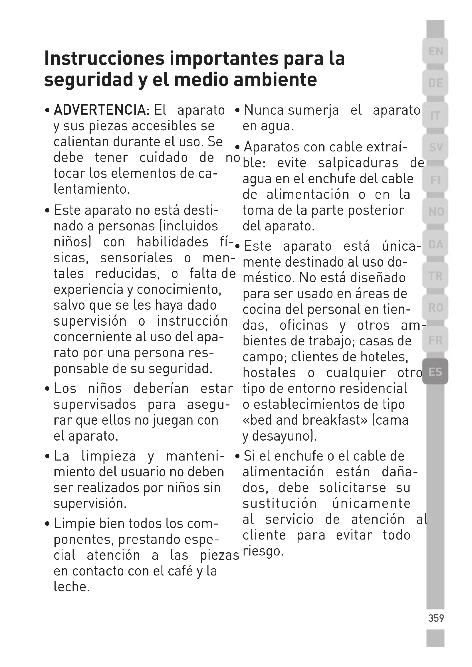- Este aparato puede ser usadoporniñosapartirde 8 años siempre y cuando esténsupervisadosohayan recibidoinstruccionessobre elusosegurodelaparato,y comprendan los peligros implicados. La limpieza y elmantenimientodeusua- rio no debe ser realizado por niños, salvo que sean mayoresde8añosyestén supervisados.Mantengael aparatoy su cordón fuera del alcance de los niños menoresde8años. Instrucciones importantes para la seguridad y el medio ambiente