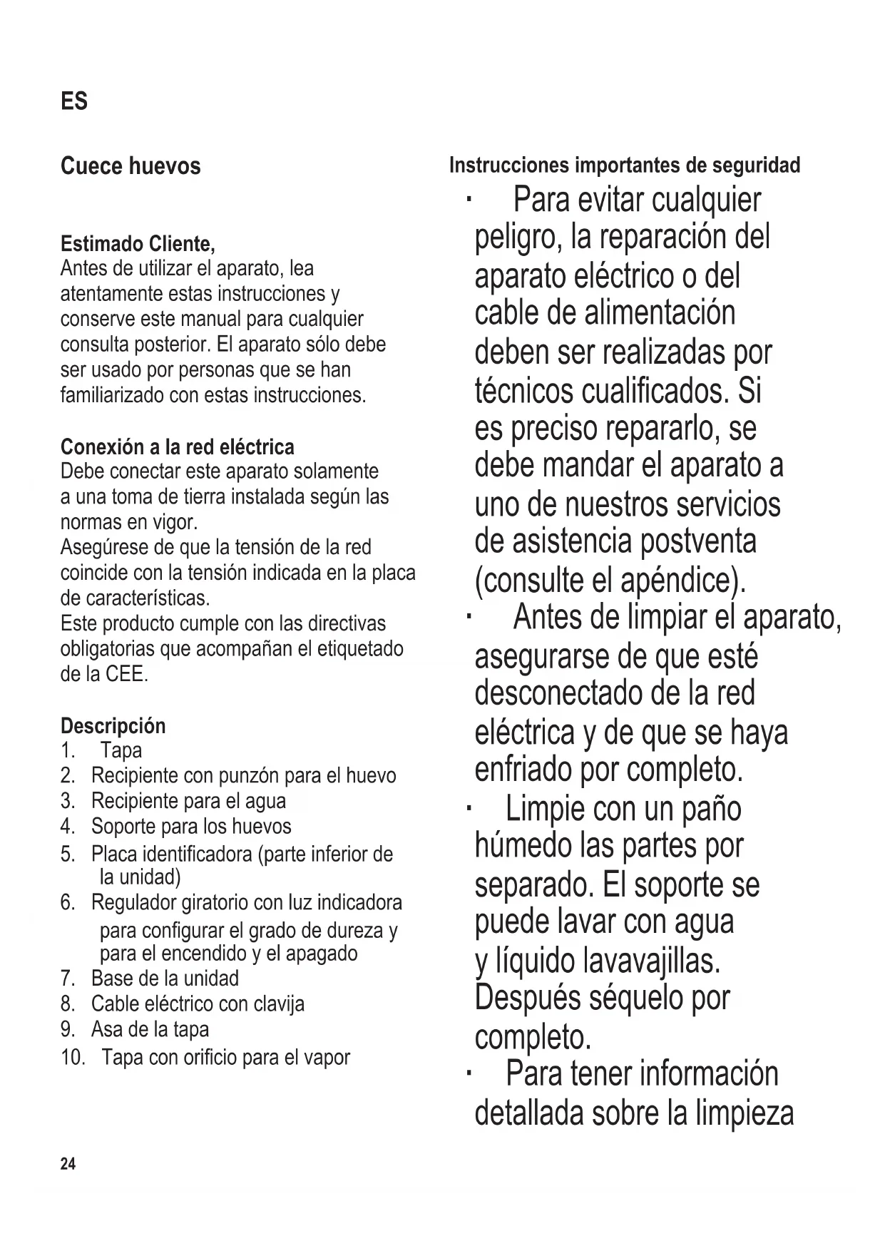 del aparato, consulte la sección Limpieza y mantenimiento. ∙ Para evitar una descarga eléctrica, no limpie el cuece huevos con agua ni lo sumerja. ∙ Este aparato ha sido diseñado para el uso doméstico u otra aplicación similar, por ejemplo - en cocinas de personal, en ocinas y otros puntos comerciales, - en empresas agrícolas, - por los clientes de hoteles, pensiones, etc. y alojamientos similares, - en casas rurales. ∙ ¡Precaución! Al utilizar el punzón. ∙ ¡Advertencia! La supercie exterior y el recipiente para el agua se calientan durante su uso y se mantienen calientes durante cierto tiempo. Agarre el aparato únicamente por su asa. ∙ ¡Advertencia! Se desprende vapor caliente por la tapa. ∙ ¡Advertencia! El uso incorrecto del aparato puede provocar lesiones. ∙ Los niños (mayores de 8 años) y personas con facultades físicas, sensoriales o mentales reducidas, o sin experiencia ni conocimiento podrán usar este aparato, siempre que sean supervisados o hayan recibido instrucciones sobre el uso del aparato de manera segura y que hayan entendido los peligros que conlleva. ∙ Los niños no deben jugar con el aparato. ∙ No se debe permitir que26 104 x 142 mm los niños realicen ningún trabajo de limpieza o mantenimiento del aparato a menos que esté bajo vigilancia y tengan más de 8 años. ∙ El aparato y su cable eléctrico siempre se deben mantener fuera del alcance de niños menores de 8 años. ∙ Precaución: Mantenga a los niños alejados del material de embalaje, porque podría ser peligroso, existe el peligro de asxia. ∙ Antes de utilizar el aparato, siempre se debe comprobar que tanto la unidad principal, el cable de alimentación como cualquier accesorio no están defectuosos. En caso de que el aparato haya caído sobre una supercie dura, o se haya tirado en exceso del cable de alimentación, no se deberá utilizar de nuevo: incluso los desperfectos no visibles pueden tener efectos adversos sobre la seguridad en el uso del aparato. En este caso, deberá ponerse en contacto con el servicio técnico. ∙ No deje el aparato sin vigilar durante su funcionamiento. ∙ Mantenga el cable separado de las partes calientes del aparato y no lo enrolle alrededor de éste hasta que se haya enfriado del todo. ∙ Desenchufe siempre el aparato - si hay una avería, - después del uso, y - antes de limpiarlo. ∙ Cuando se desenchufa la clavija de la pared, nunca tirar del cable de alimentación; sino asir siempre la clavija misma. ∙ Durante su funcionamiento, el aparato se debe colocar en una supercie plana resistente al calor y al agua. ∙ No coloque el aparato encima o cerca de supercies calientes, como una placa de cocina o una cocina de gas. El aparato no debe funcionar mientras está situado debajo de objetos o muebles sensibles, como armarios empotrados, debido al vapor caliente expulsado por la tapa durante su funcionamiento. ∙ No se acepta responsabilidad alguna si hay averías a consecuencia del uso incorrecto del aparato o si estas instrucciones no han sido observadas debidamente. Antes de utilizarlo por primera vez ∙ Saque el aparato y retire todo el material de embalaje y las pegatinas publicitarias. No se debe quitar la placa identicadora. ∙ Utilice el aparato una vez con el soporte para los huevos, pero sin huevos, congurado al grado de dureza medio, tal y como se describe en el apartado «Modo de empleo».104 x 142 mm