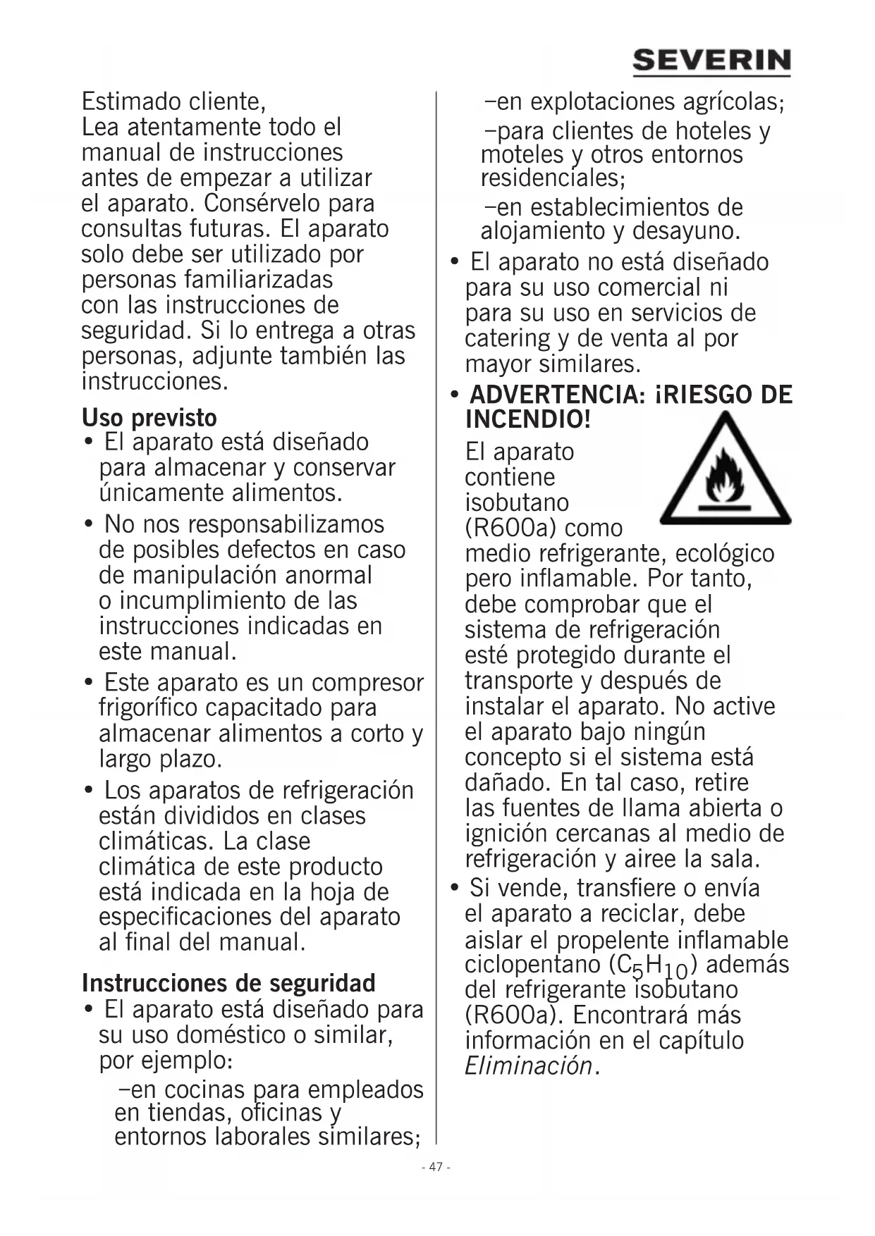 - ADVERTENCIA: ¡RIESGO DE INCENDIO! El aparato contiene isobutano (R600a) como medio refrigerante, ecológico pero inamable. Por tanto, debe comprobar que el sistema de refrigeración esté protegido durante el transporte y después de instalar el aparato. No active el aparato bajo ningún concepto si el sistema está dañado. En tal caso, retire las fuentes de llama abierta o ignición cercanas al medio de refrigeración y airee la sala.