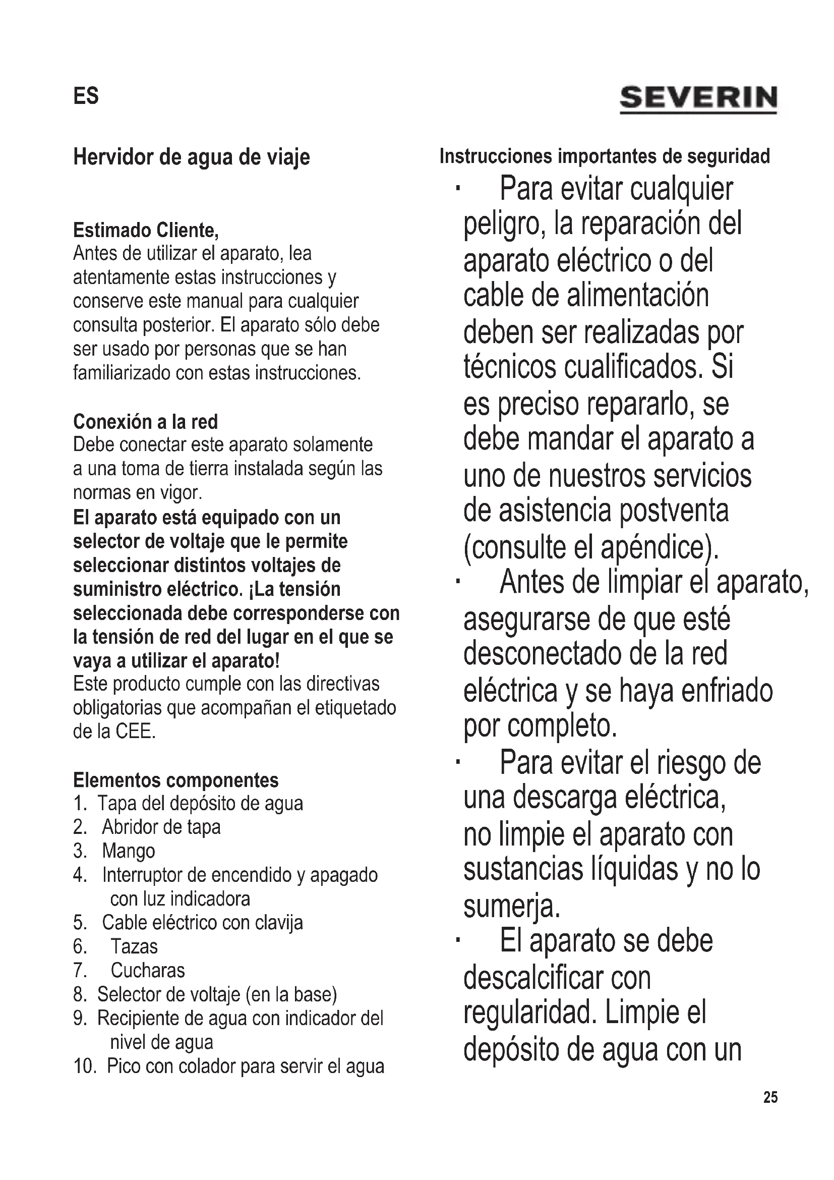 Hervidor de agua de viaje Estimado Cliente, Antes de utilizar el aparato, lea atentamente estas instrucciones y conserve este manual para cualquier consulta posterior. El aparato sólo debe ser usado por personas que se han familiarizado con estas instrucciones. Conexión a la red Debe conectar este aparato solamente a una toma de tierra instalada según las normas en vigor. El aparato está equipado con un selector de voltaje que le permite seleccionar distintos voltajes de suministro eléctrico. ¡La tensión seleccionada debe corresponderse con la tensión de red del lugar en el que se vaya a utilizar el aparato! Este producto cumple con las directivas obligatorias que acompañan el etiquetado de la CEE. Elementos componentes