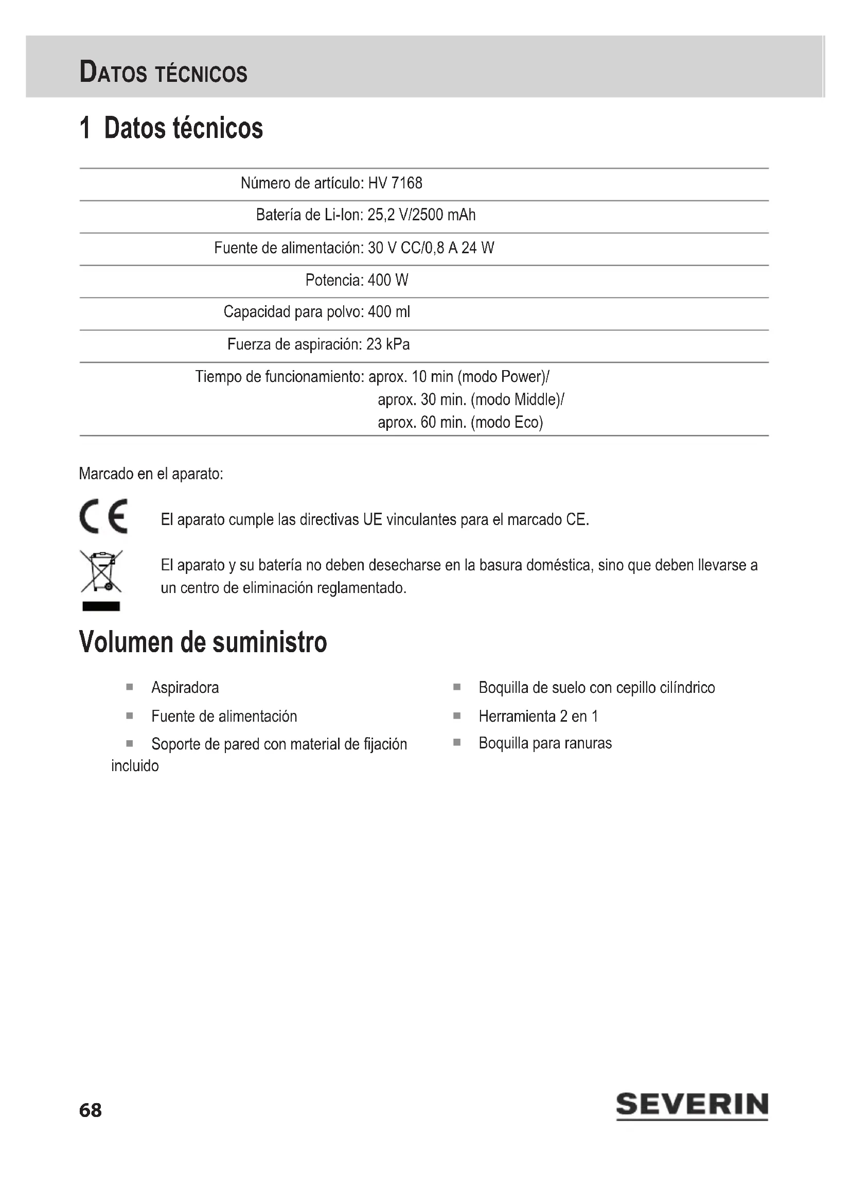 Alleen met een correct werkende accu is het apparaat weer gebruiksklaar. Als geen correct werkende accu is geplaatst, het apparaat niet in bedrijf nemen. 10 Verwijderen Apparaten en accu's die met dit symbool zijn gemarkeerd, moeten gescheiden van het huisvuil worden afgevoerd. Deze apparaten en accu's bevatten waardevolle materialen die gerecycled kunnen worden. Een correcte verwijdering beschermt het milieu en de gezondheid van de medemens. Het apparaat en de uitgebouwde accu afzonderlijk voor verwijdering naar de over- eenkomstige inzamelpunten brengen. Uw gemeenteadministratie of uw dealer geeft informatie over de correcte afvoer.64 GaranTiE 11 Garantie De wettelijke garantierechten voor de verkoper en evt. verkopergaranties worden niet aangetast door de onderstaande garantievoorwaarden. Mocht reparatie nodig zijn, neem dan telefonisch of via e-mail contact op met onze klantenservice. De contactgegevens vindt u in de bijlage van deze handleiding. Bij garantiegevallen kunt u als alternatief ook direct contact opnemen met de dealer. Bovendien geeft SEVERIN een fabrieksgarantie van twee jaar vanaf de datum van aankoop. In deze periode repareren wij kosteloos alle gebreken die aantoonbaar veroorzaakt worden door materiaal- of productiefouten en die de werking aanzienlijk verminderen. Verdere claims zijn uitgesloten. Van garantie uitgesloten is: Schade die terug te voeren is op de niet-inachtneming van de handleiding, ondes- kundige behandeling of normale slijtage, evenals licht breekbare onderdelen zoals glas, kunststof of gloeilam- pen. De garantie komt te vervallen bij ingreep door instanties die niet door SEVERIN geautoriseerd zijn. Als deze tabel u niet verder helpt, neem dan contact op met onze klantenservice. De contactgegevens vindt u in de bijlage van deze handleiding of op www.severin.com.65 GaranTiE66 Muchas gracias Apreciada compradora, apreciado comprador: Deseamos que disfrute con este producto de calidad de SEVERIN y le agradecemos su conanza. Es67 Sobre este manual de instrucciones Este manual de instrucciones contiene consejos importantes para su seguridad, así como sobre el uso del aparato. En caso de que no se sigan las instrucciones de este manual pueden producirse lesiones personales y daños materiales en el aparato. Guarde bien el manual de instrucciones. Si el aparato se entrega a terceros, se debe entregar asimismo el manual de instrucciones. Lea el manual de instrucciones por completo antes del primer uso. Se incluye una guía de inicio rápido con ilustraciones Este manual de instrucciones incluye una guía de inicio rápido que le proporciona más consejos sobre el uso y el cuidado del aparato. En caso necesario, este manual de instrucciones y la guía de inicio rápido pueden descargarse gratuitamente de Internet en www.severin.com. Contenido 1 Datos técnicos 68 2 Indicaciones de seguridad 69 3 Montaje del aparato y carga de la batería 74 4 Aspiración de polvo 75 5 Limpieza y mantenimiento del aparato 76 6 Almacenamiento del aparato 78 7 Piezas de repuesto/accesorios 78 8 Cómo solucionar problemas uno mismo 78 9 Desmontaje/sustitución de la batería 79 10 Eliminación 80 11 Garantía 80 Es68 DaTos Técnicos 1 Datos técnicos Número de artículo: HV 7168 Batería de Li-Ion: 25,2 V/2500 mAh Fuente de alimentación: 30 V CC/0,8 A 24 W Potencia: 400 W Capacidad para polvo: 400 ml Fuerza de aspiración: 23 kPa Tiempo de funcionamiento: aprox. 10 min (modo Power)/ aprox. 30 min. (modo Middle)/ aprox. 60 min. (modo Eco) Marcado en el aparato: El aparato cumple las directivas UE vinculantes para el marcado CE. El aparato y su batería no deben desecharse en la basura doméstica, sino que deben llevarse a un centro de eliminación reglamentado. Volumen de suministro Aspiradora Fuente de alimentación Soporte de pared con material de jación incluido Boquilla de suelo con cepillo cilíndrico Herramienta 2 en 1 Boquilla para ranuras69 inDicacionEs DE sEGuriDaD 2 Indicaciones de seguridad Grupos de personas especícos Este aparato puede ser manejado por niños mayores de 8 años, así como por personas con capacidades físicas, sensoriales o mentales reducidas o con falta de experiencia o conocimientos bajo supervisión o si han sido debidamen- te instruidos sobre el uso seguro del aparato y los riesgos derivados del mismo. Los niños no deben jugar con el aparato ni colocarse o sentarse encima. La limpieza y el mantenimiento no deben ser realizados por niños sin supervisión. Los niños menores de 8 años deben mantenerse alejados del aparato y de la fuente de alimentación. El material de embalaje no puede ser usado como un juguete. Existe riesgo de asxia. Conexión segura del aparato El aparato se carga con corriente eléctrica, por lo que existe riesgo de electro- cución. Por ello: Revise posibles daños en el aparato y la fuente de alimentación antes de su uso. No utilice nunca un aparato defectuoso o con una fuente de alimentación defectuosa. Conecte la fuente de alimentación solo a tomas de corriente que se corres- pondan con los datos indicados en la placa de características de la fuente de alimentación.70 inDicacionEs DE sEGuriDaD No intente nunca reparar por cuenta propia el aparato o la fuente de ali- mentación. Para evitar riesgos, las reparaciones del aparato y la fuente de alimentación deben ser realizadas exclusivamente por nuestro servicio de atención al cliente. Si el aparato está defectuoso, llévelo a reparar a un comer- cio especializado o contacte con el servicio de atención al cliente de SEVERIN (encontrará los datos de contacto en el anexo de este manual de instrucciones o en www.severin.de). No sumerja el aparato ni la fuente de alimentación en agua ni ningún otro líquido ni lo trate con líquido alguno. Mantenga el aparato y la fuente de ali- mentación alejados de la lluvia y la humedad. No ponga en funcionamiento el aparato ni la fuente de alimentación al aire libre o en espacios con una elevada humedad ambiental. No toqu