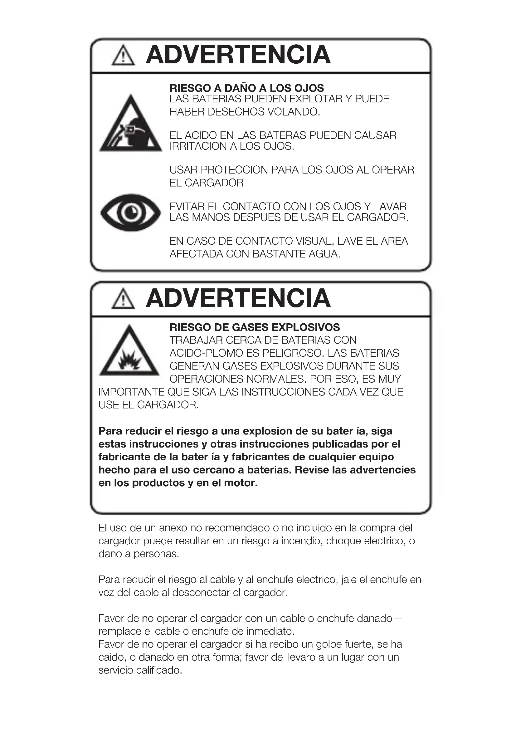 IMPORTANTE QUE SIGA LAS INSTRUCCIONES CADA VEZ QUE USE EL CARGADOR. Para reducir el riesgo a una explosion de su bater ía, siga estas instrucciones y otras instrucciones publicadas por el fabricante de la bater ía y fabricantes de cualquier equipo hecho para el uso cercano a baterias. Revise las advertencies en los productos y en el motor. El uso de un anexo no recomendado o no incluido en la compra del cargador puede resultar en un riesgo a incendio, choque electrico, o dano a personas. Para reducir el riesgo al cable y al enchufe electrico, jale el enchufe en vez del cable al desconectar el cargador. Favor de no operar el cargador con un cable o enchufe danado— remplace el cable o enchufe de inmediato. Favor de no operar el cargador si ha recibo un golpe fuerte, se ha caido, o danado en otra forma; favor de llevaro a un lugar con un servicio calificado.32 FAVOR DE NO USAR EXTENSIONES al menos que sea absolutamente necesario. Al usar extensions equivocadas puede resultar en un riesgo a incendio y choques electricos y puede resultar en dano a su propiedad, daño personal o muerte. Si las extensions tienen que ser usadas, asgurese que: 1.) Los pivotes de la extension tengan el mismo numero, tamano, y forma de el enchufe del cargador. 2.) La extension este en buenas condiciones electricas y haya sido armada apropiadamente. 3.) El tamano del cable es como esta especificado como en la Tabla 1 debajo: EL TAMANO AWG ES RECOMENDADO COMO EL TAMANO MINIMO PARA LA EXTENSION PARA EL CARGADOR. TABLA 1: CLASIFICACION DEL