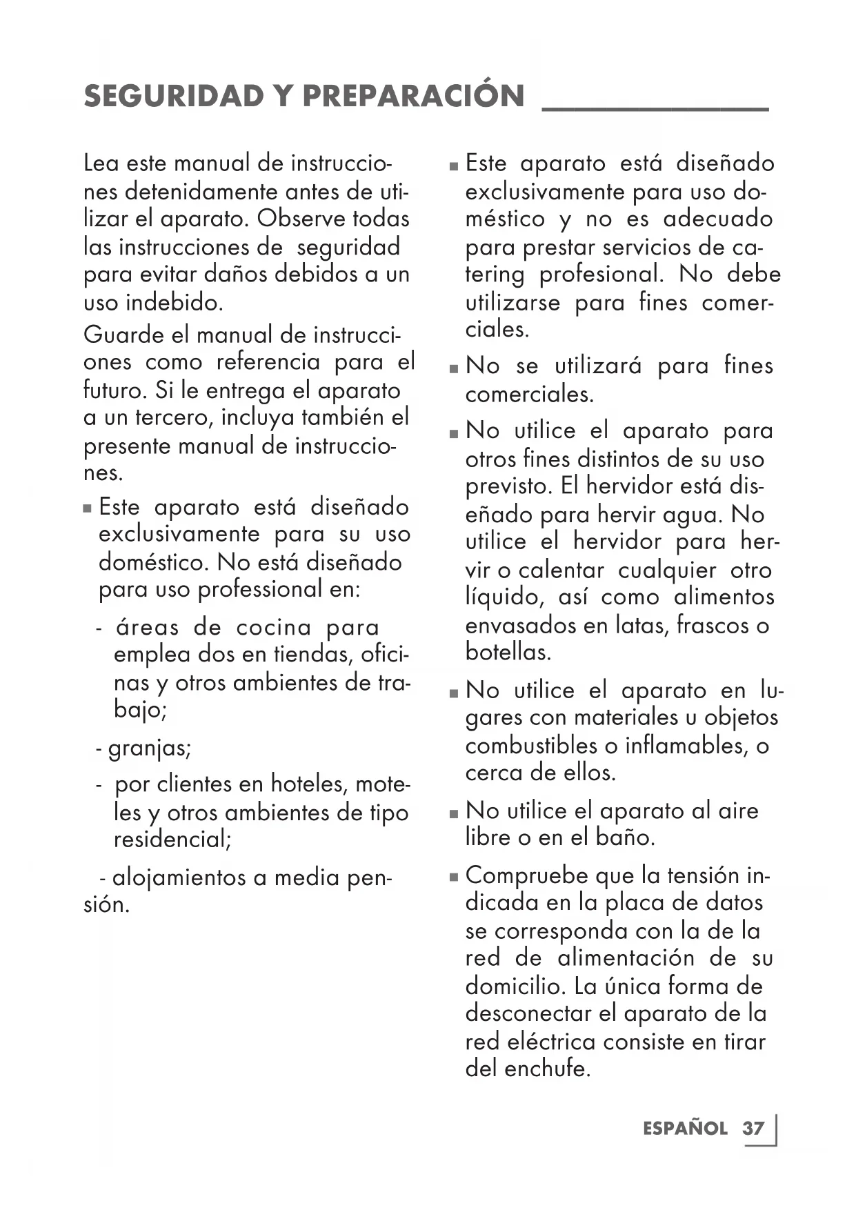 No utilice el aparato para otros fines distintos de su uso previsto. El hervidor está dis- eñado para hervir agua. No utilice el hervidor para her- vir o calentar cualquier otro líquido, así como alimentos envasados en latas, frascos o botellas.
