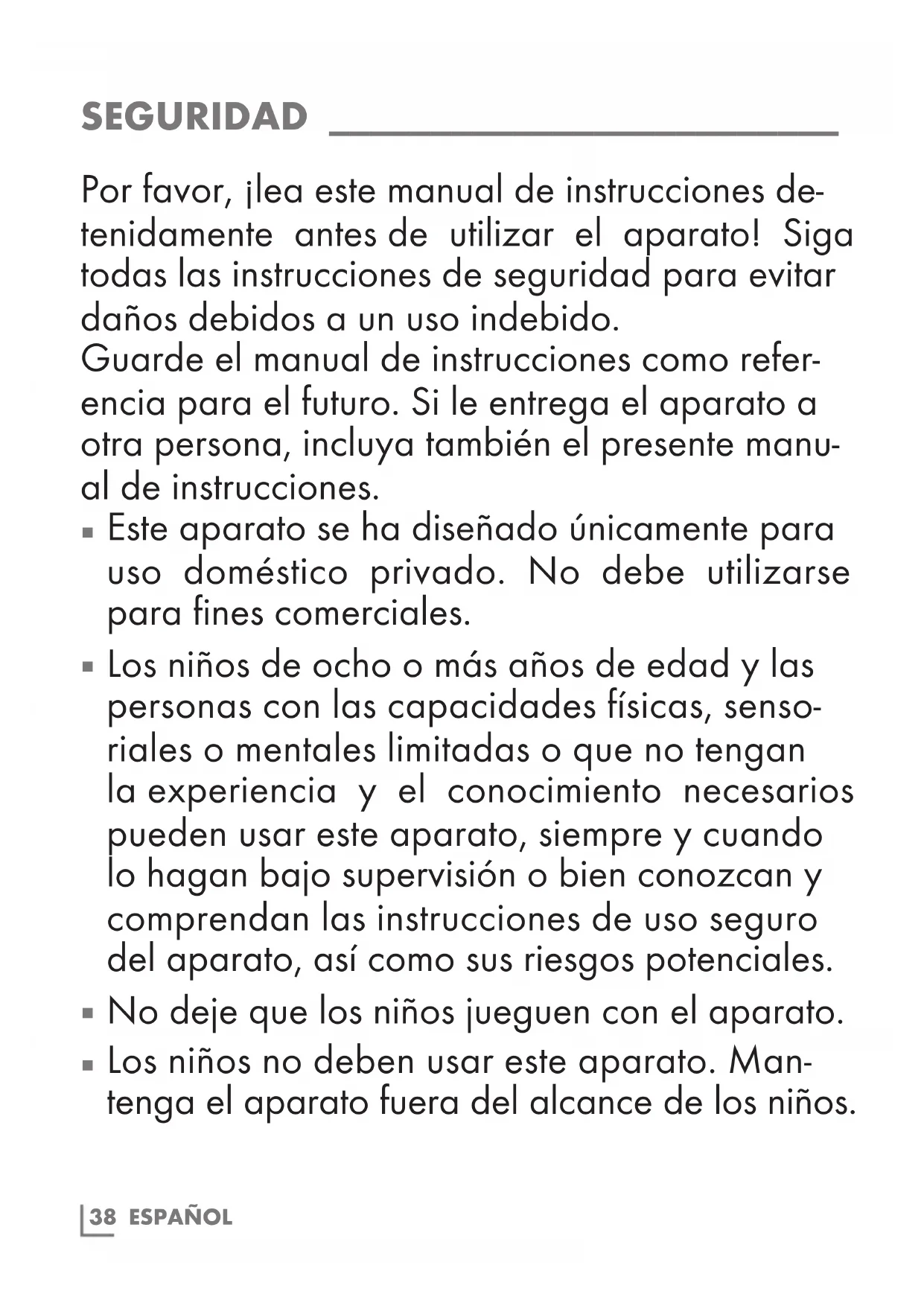 Los niños no deben usar este aparato. Man- tenga el aparato fuera del alcance de los niños.ESPAÑOL 39 SEGURIDAD _________________________