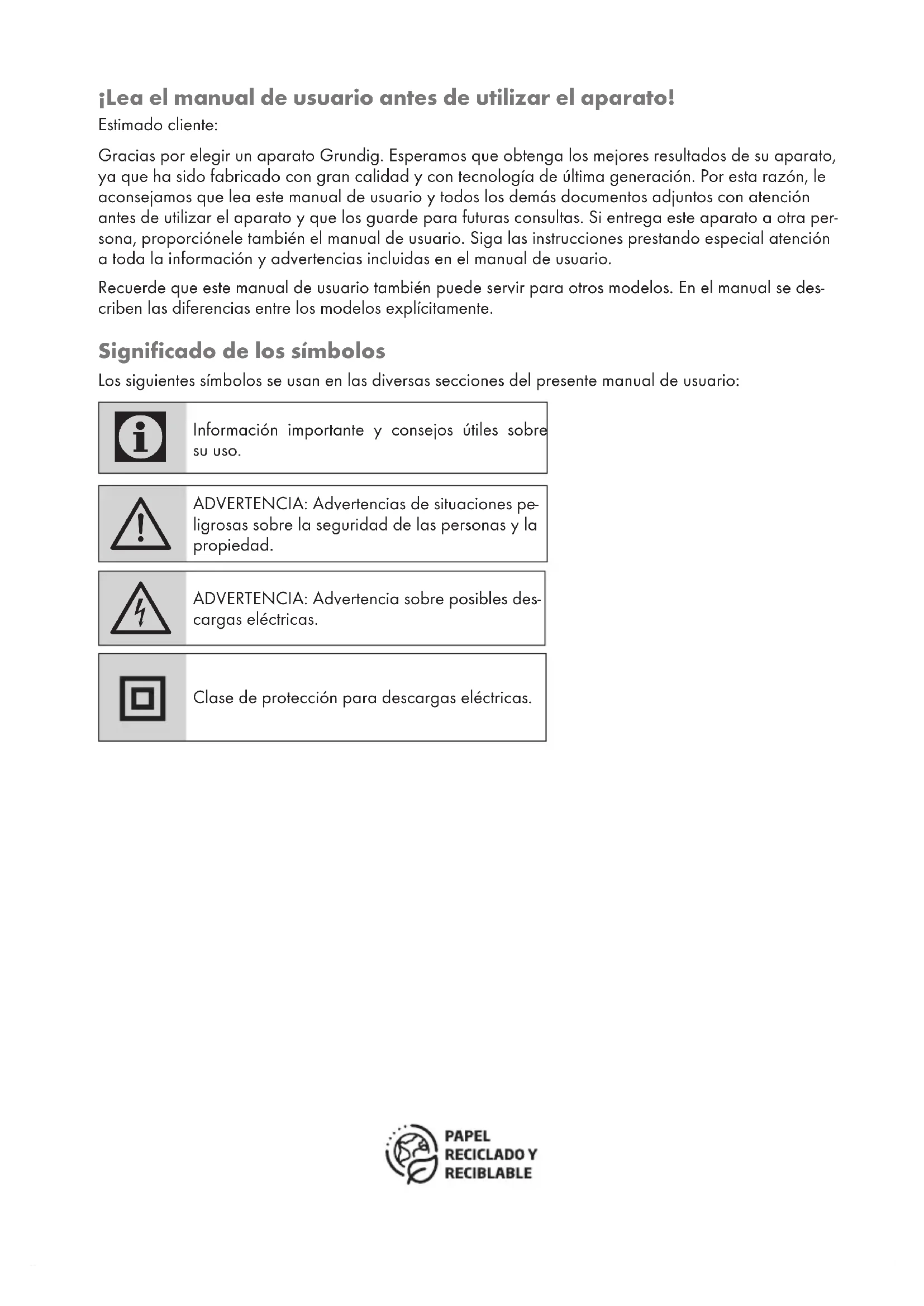 ADVERTENCIA: Advertencia sobre posibles des- cargas eléctricas. Clase de protección para descargas eléctricas.39 ESPAÑOL