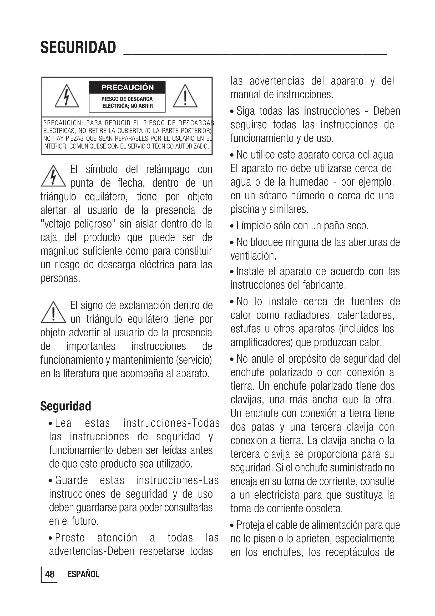 - Proteja el cable de alimentación para que no lo pisen o lo aprieten, especialmente en los enchufes, los receptáculos de PRECAUCIÓNPRECAUCIÓN: PARA REDUCIR EL RIESGO DE DESCARGAS ELÉCTRICAS, NO RETIRE LA CUBIERTA (O LA PARTE POSTERIOR). NO HAY PIEZAS QUE SEAN REPARABLES POR EL USUARIO EN EL INTERIOR. COMUNÍQUESE CON EL SERVICIO TÉCNICO AUTORIZADO.RIESGO DE DESCARGA ELÉCTRICA; NO ABRIR49 ESPAÑOL SEGURIDAD ________________________________ conveniencia y el punto en el que salen del aparato.