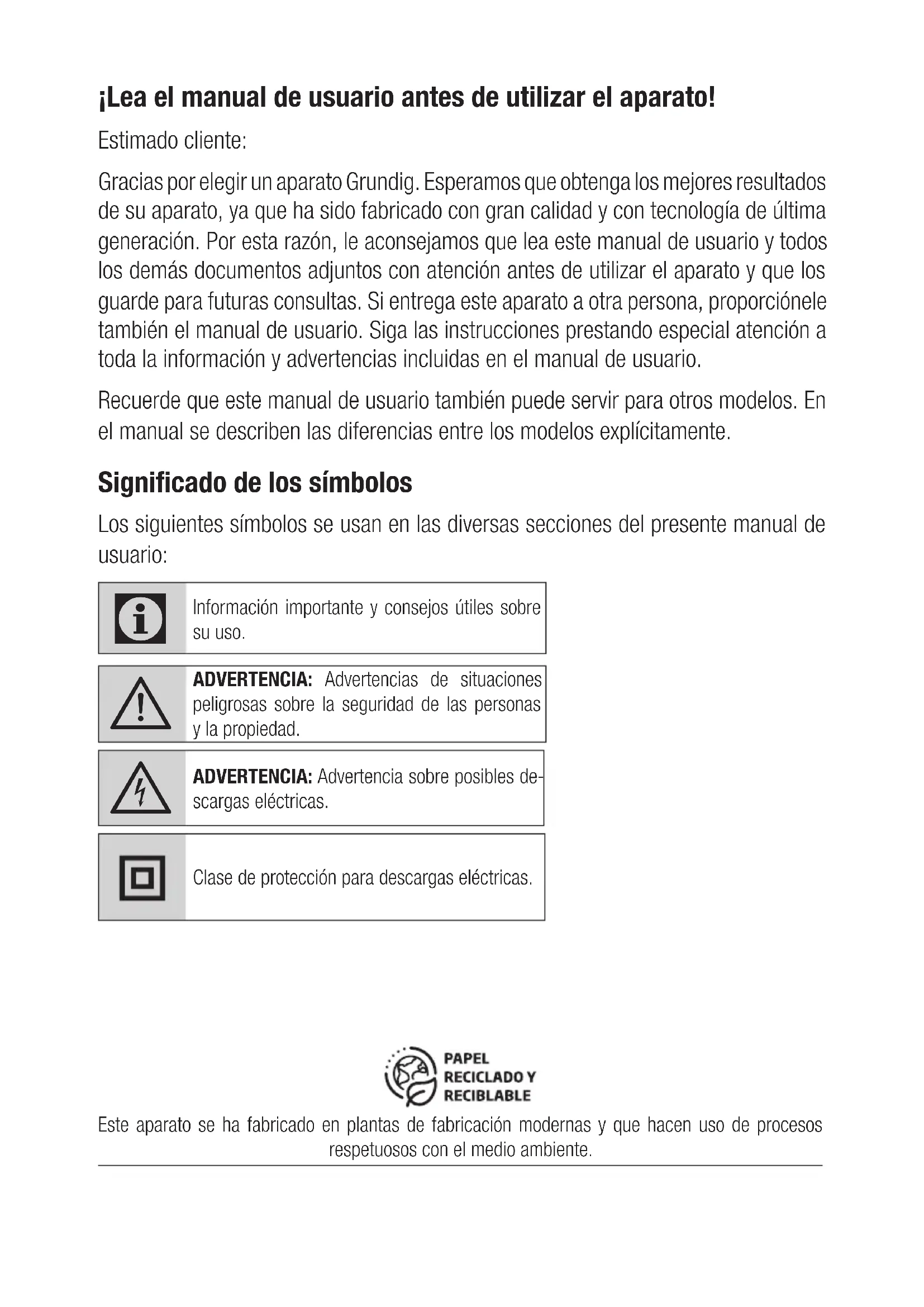 ADVERTENCIA: Advertencia sobre posibles de- scargas eléctricas. Clase de protección para descargas eléctricas. Este aparato se ha fabricado en plantas de fabricación modernas y que hacen uso de procesos respetuosos con el medio ambiente.55 ESPAÑOL Las instrucciones de seguridad y de funcionamiento deben conservarse para futuras con- sultas.