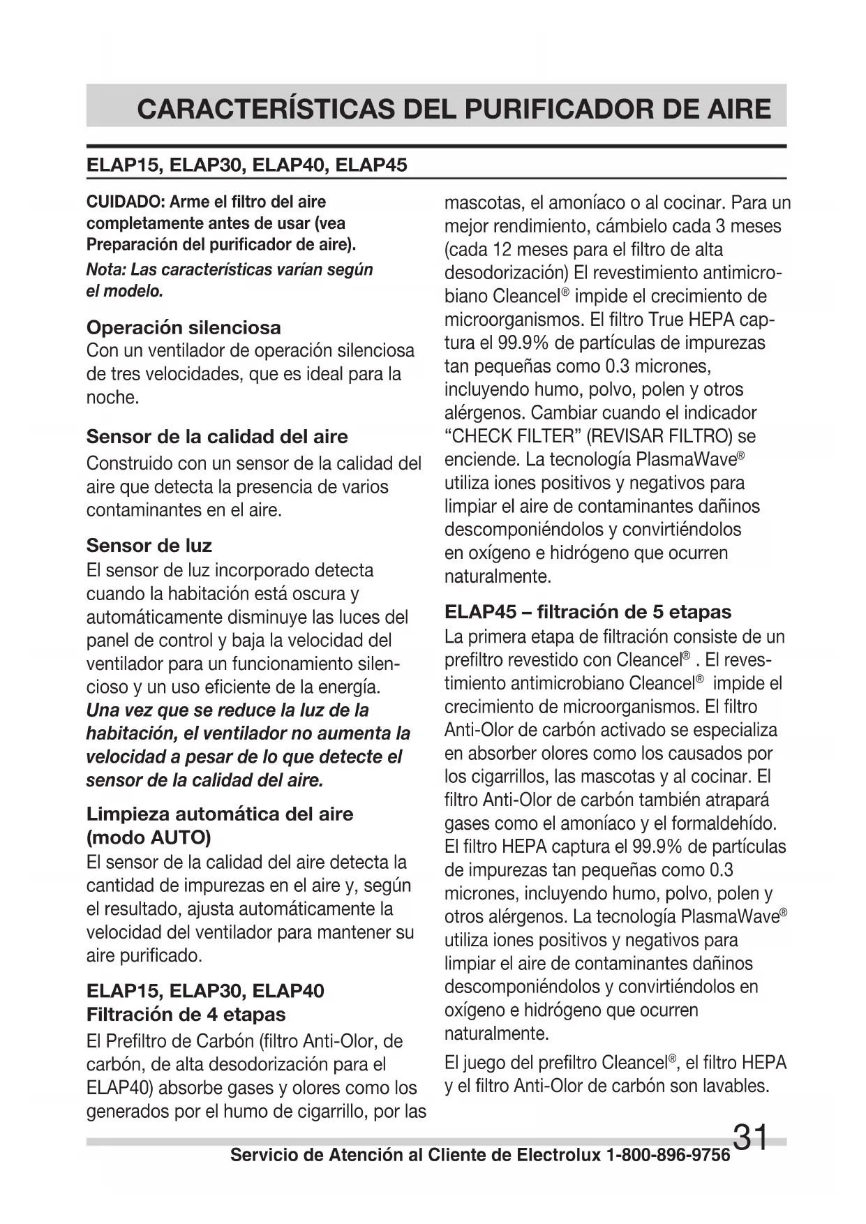 Servicio de Atención al Cliente de Electrolux 1-800-896-9756CAMBIO DE LOS FILTROS ELAP15, ELAP30 Hay dos filtros separados: El Prefiltro de Carbón y el filtro HEPA.