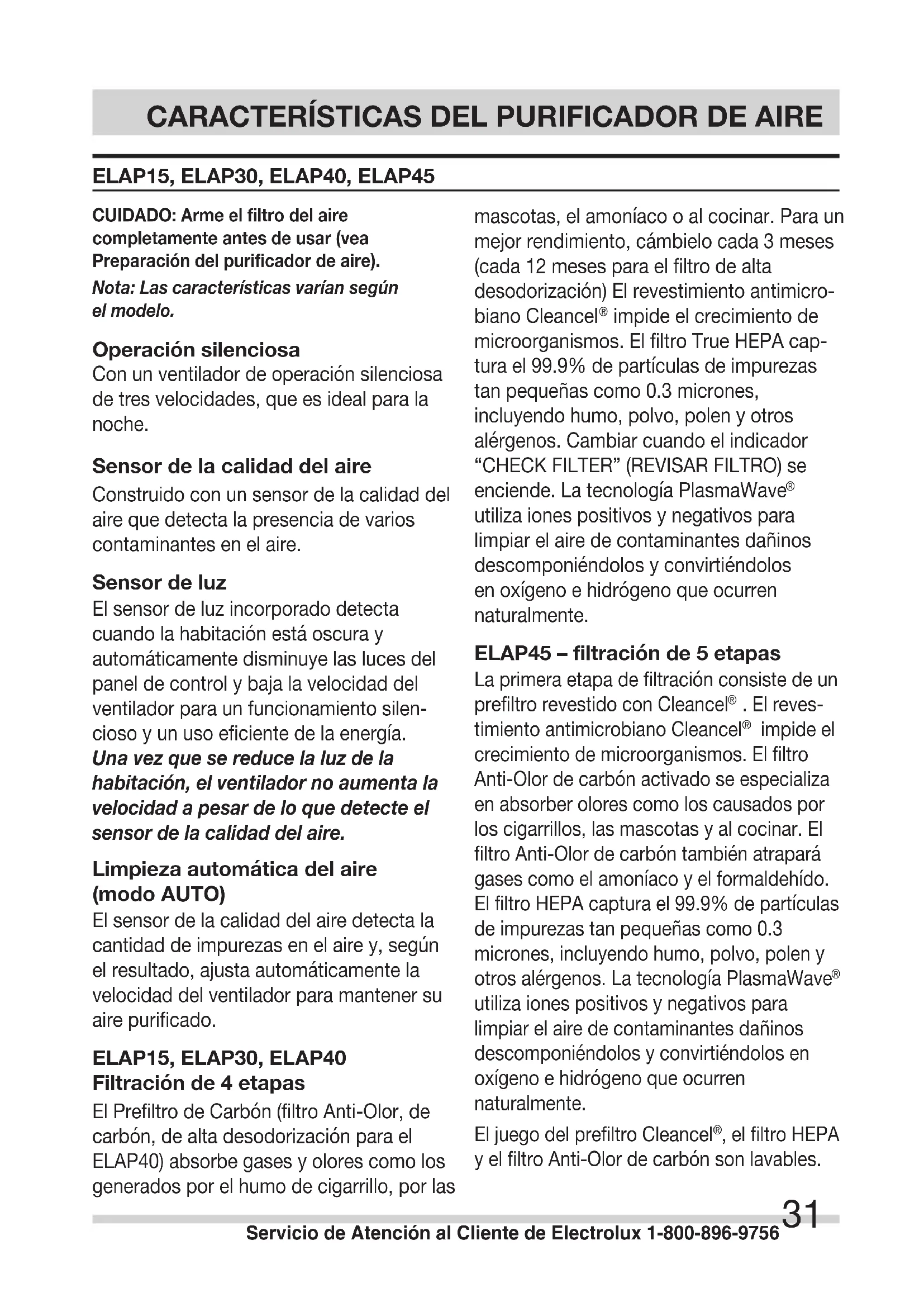 Servicio de Atención al Cliente de Electrolux 1-800-896-9756CAMBIO DE LOS FILTROS ELAP15, ELAP30 Hay dos filtros separados: El Prefiltro de Carbón y el filtro HEPA.