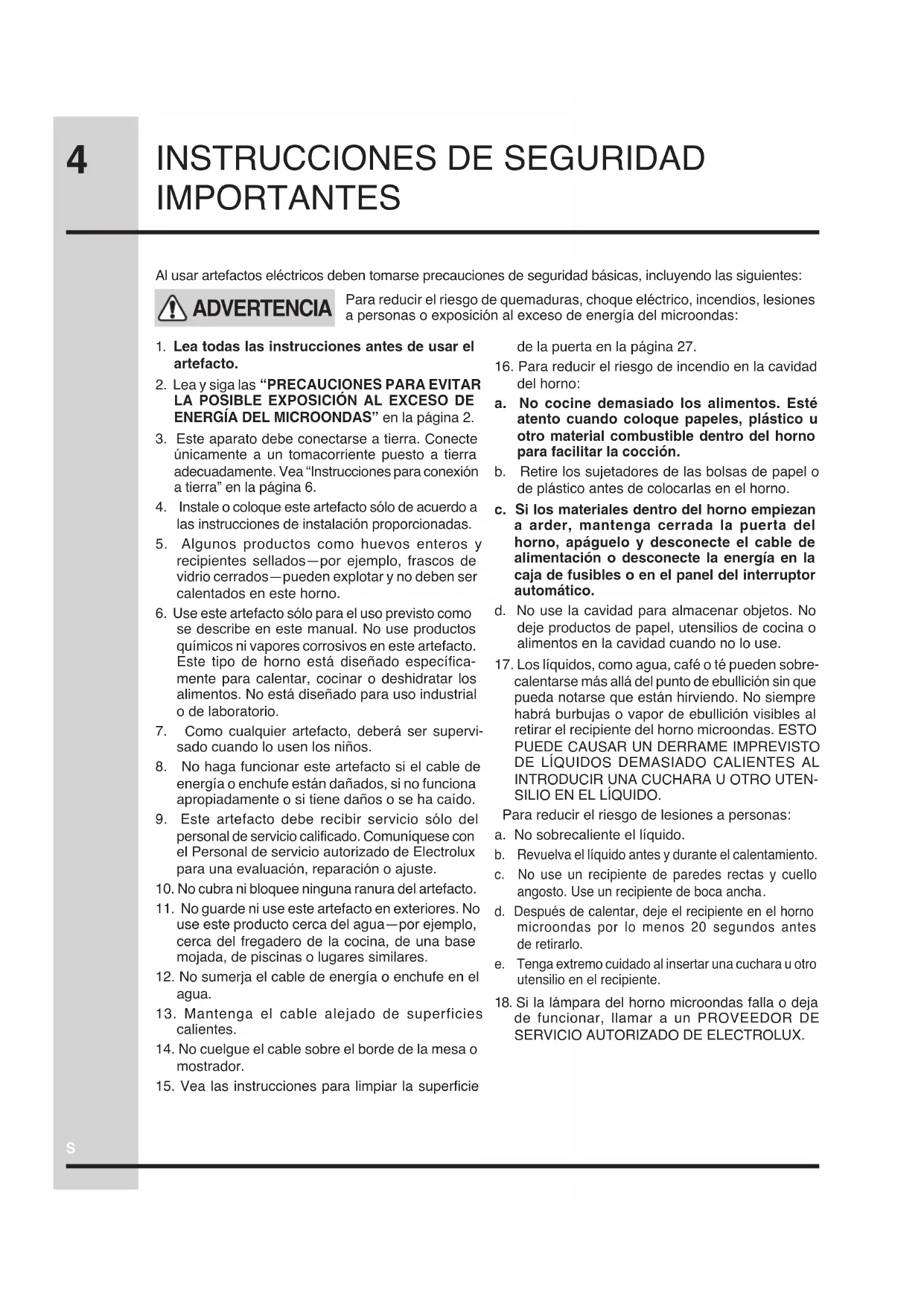 IMPORTANTES Al usar artefactos eléctricos deben tomarse precauciones de seguridad básicas, incluyendo las siguientes: Para reducir el riesgo de quemaduras, choque eléctrico, incendios, lesiones a personas o exposición al exceso de energía del microondas: