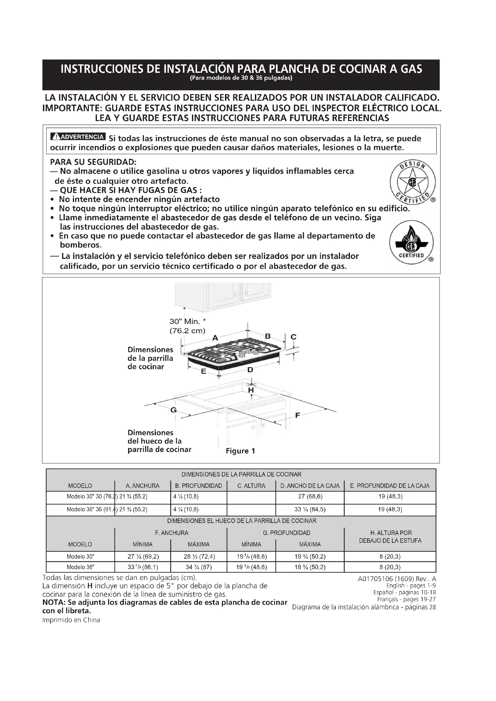 Espacio mínimo desde el lado izquierdo y desde el lado derecho Modelo 30" 30" (76,2 cm) 2 ½" (6,4 cm) 9" (22,9 cm) Modelo 36" 36" (91,4 cm) 2 ¾" (7 cm) 9" (22,9 cm)INSTRUCCIONES DE INSTALACIÓN PARA PLANCHA DE COCINAR A GAS (Para modelos de 30 & 36 pulgadas)