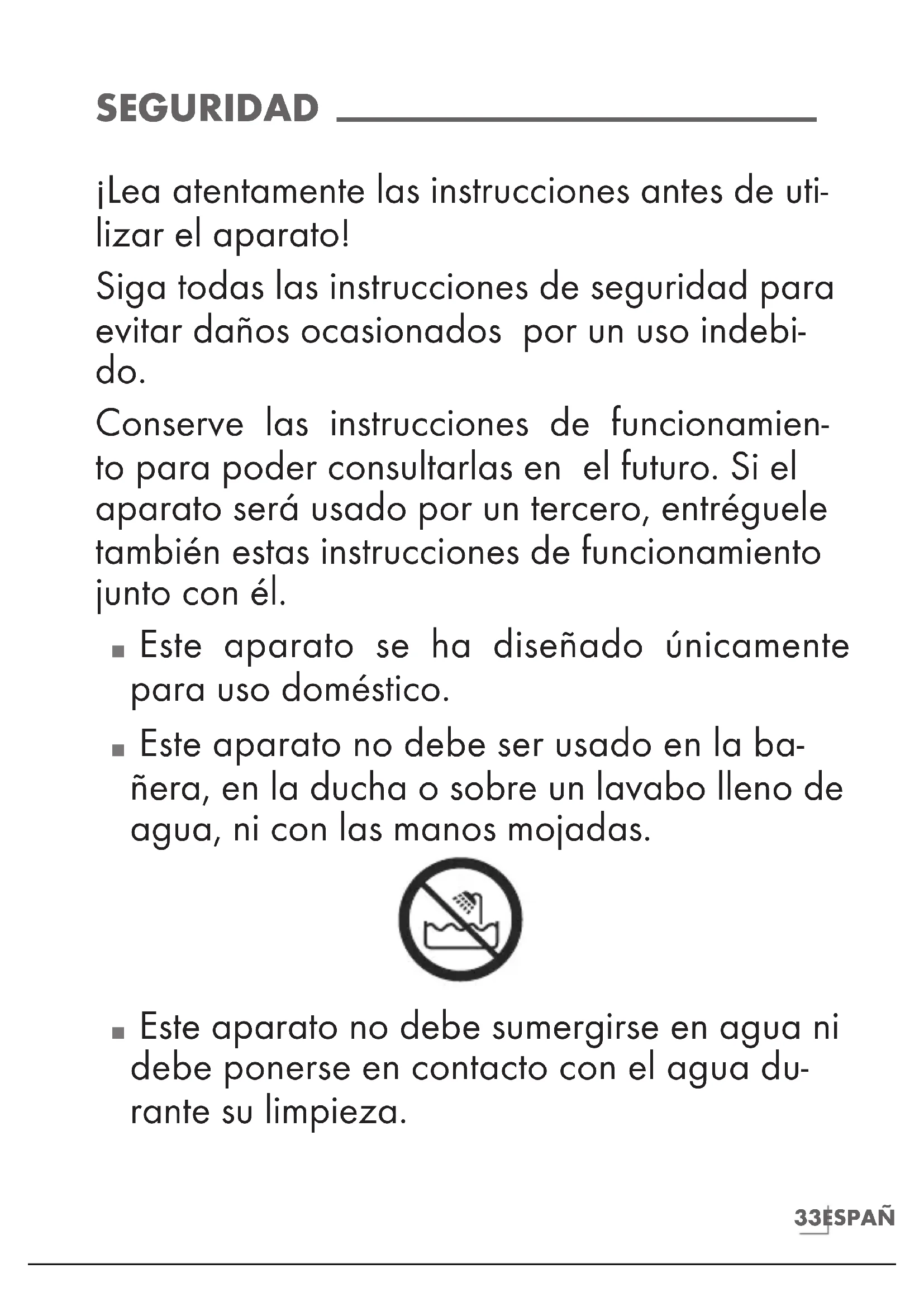 Este aparato no debe sumergirse en agua ni debe ponerse en contacto con el agua du- rante su limpieza.34 ESPAÑOL SEGURIDAD