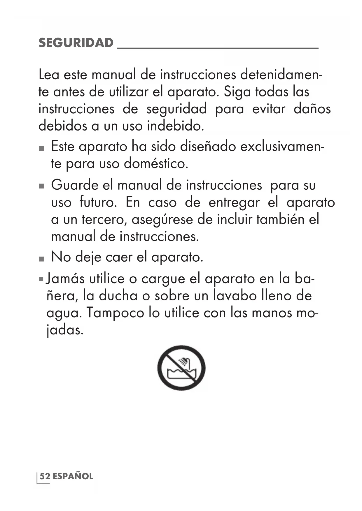 Jamás utilice o cargue el aparato en la ba- ñera, la ducha o sobre un lavabo lleno de agua. Tampoco lo utilice con las manos mo- jadas.53ESPAÑOL SEGURIDAD ______________________________