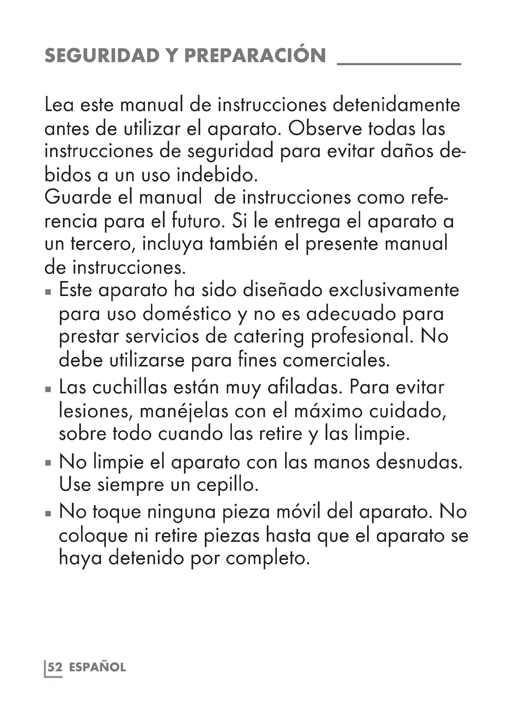 No toque ninguna pieza móvil del aparato. No coloque ni retire piezas hasta que el aparato se haya detenido por completo.ESPAÑOL 53
